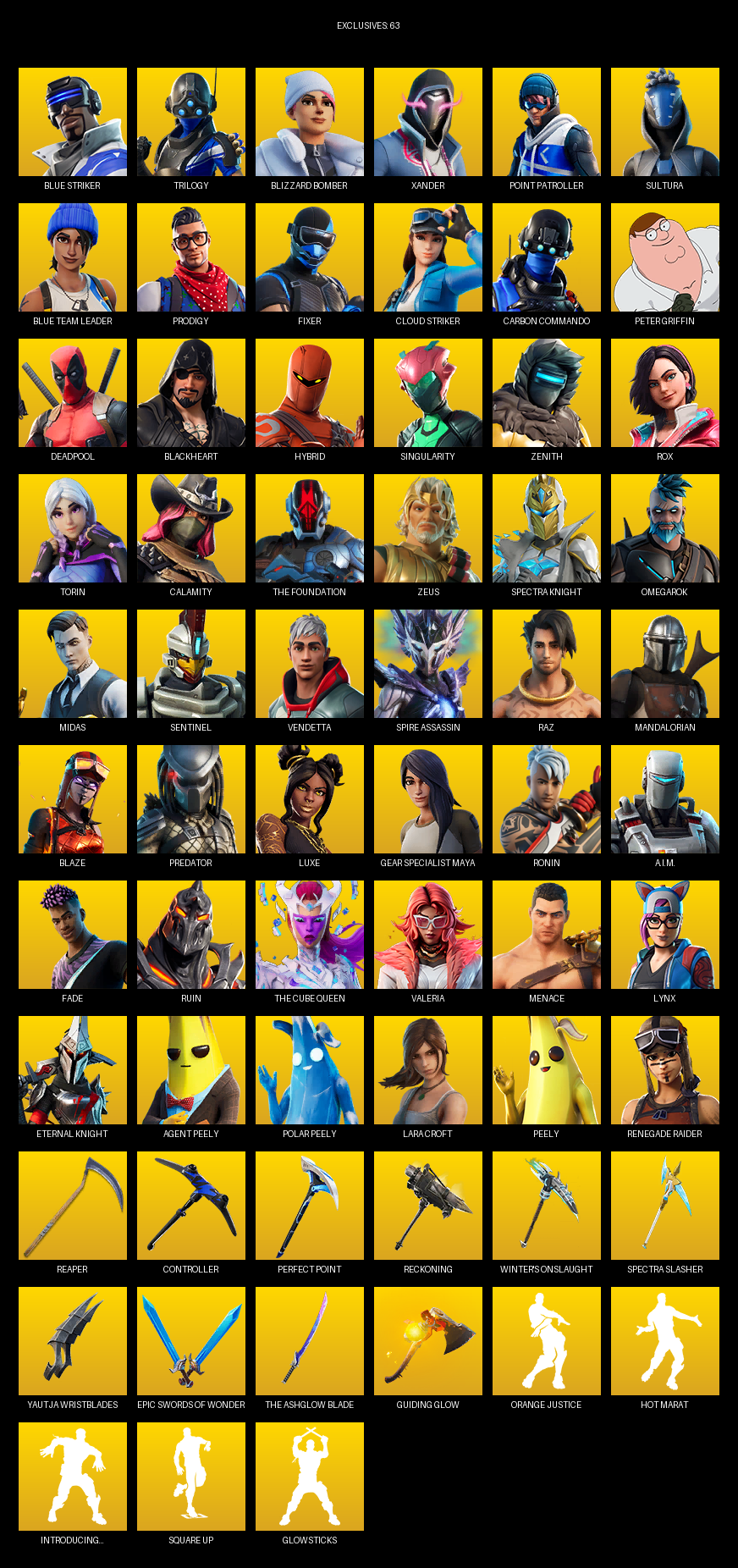 Point Patroller, Gear Specialist Maya, Lara Croft, Renegade Raider, Blue Striker, Trilogy, Blizzard Bomber, Xander, Sultura, Prodigy, Fixer, Carbon Commando, Peter Griffin, Deadpool, Blackheart, Hybrid, Singularity, Zenith