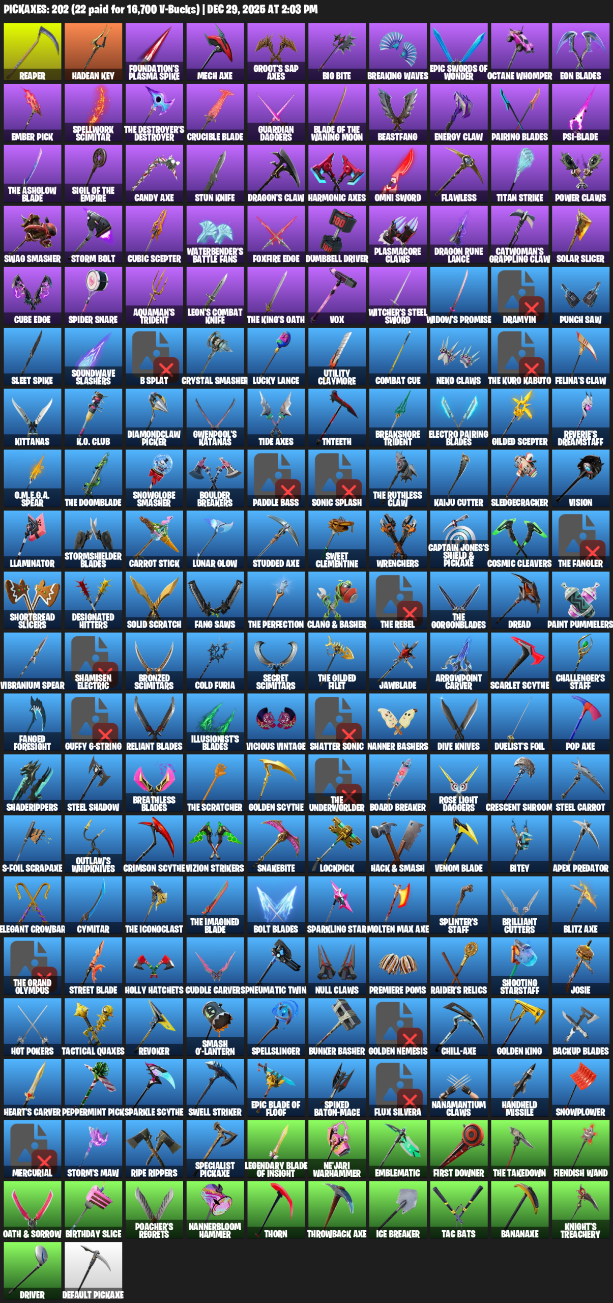 Reaper, Hadean Key, Foundation’s Plasma Spike, Mech Axe, Groot’s Sap Axes, Big Bite, Breaking Waves, Octane Whomper, Eon Blades, Ember Pick, Spellwork Scimitar, The Destroyer’s Destroyer, Crucible Blade, Guardian Daggers, Beastfang, Energy Claw