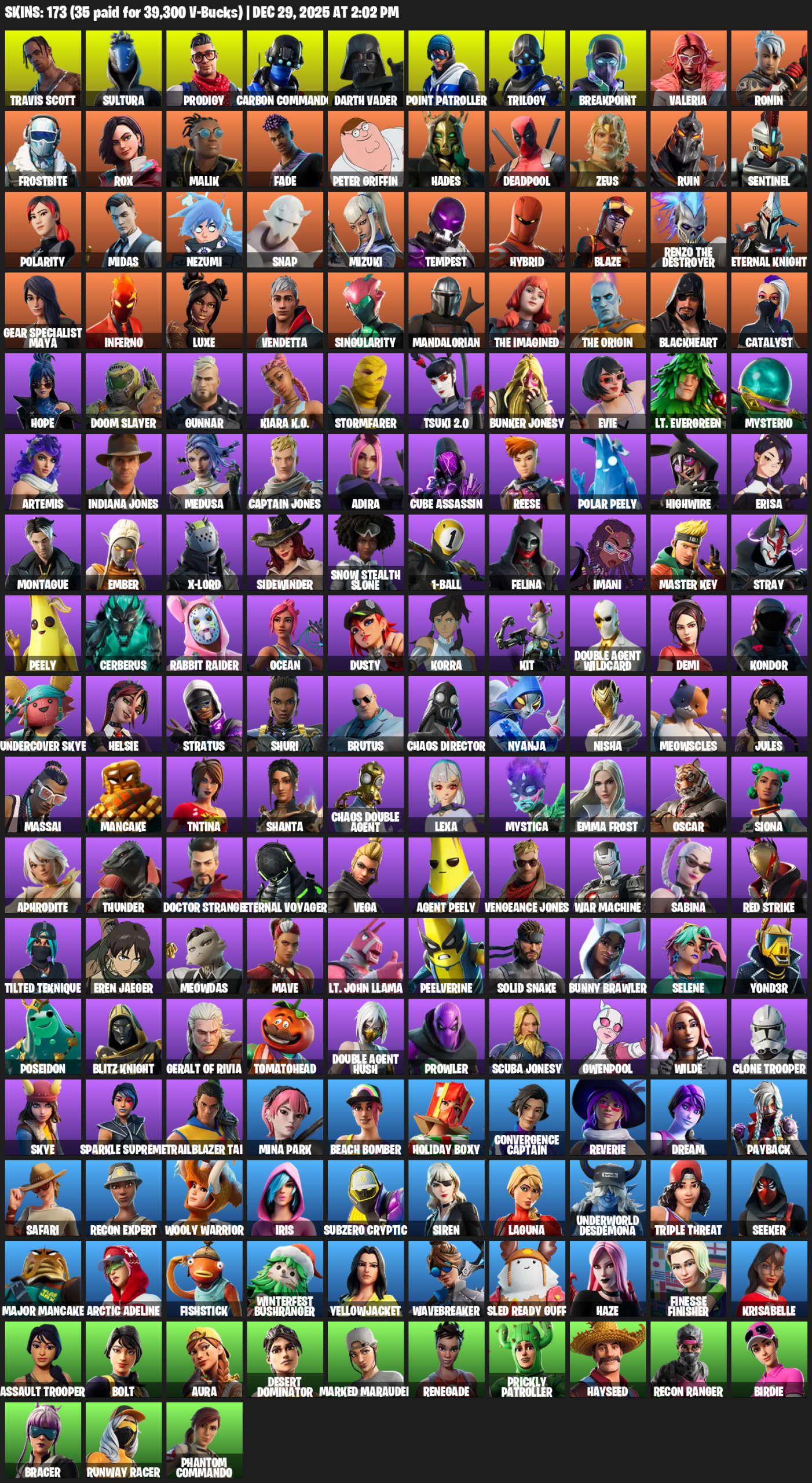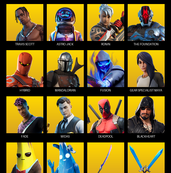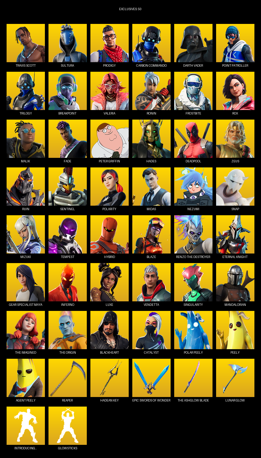 Travis Scott, Point Patroller, Gear Specialist Maya, Sultura, Prodigy, Carbon Commando, Darth Vader, Trilogy, Breakpoint, Valeria, Ronin, Frostbite, Rox, Malik, Fade, Peter Griffin, Hades, Deadpool, Zeus, Ruin