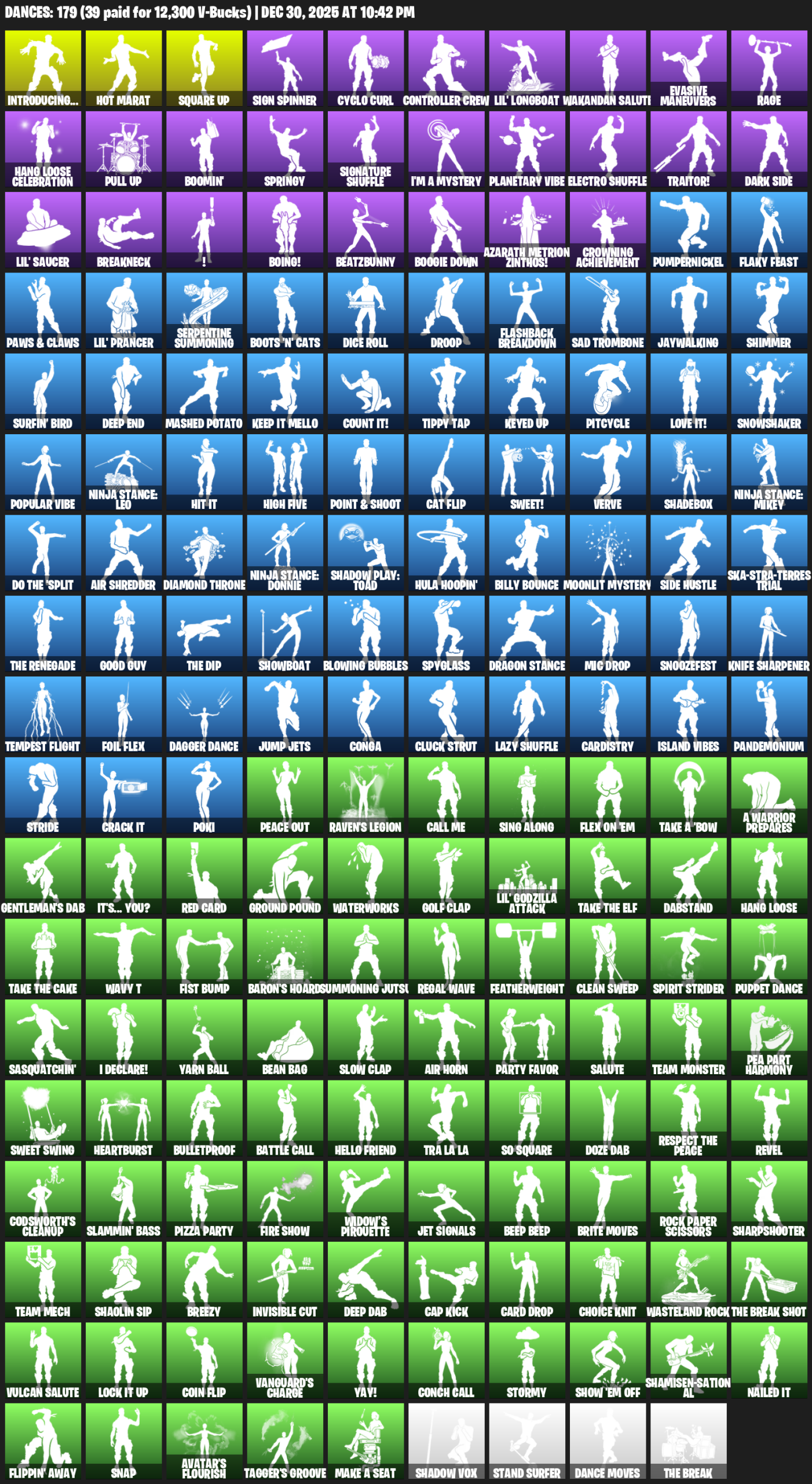 Introducing…, Hot Marat, Square Up, Sign Spinner, Cyclo Curl, Controller Crew, Lil’ Longboat, Wakandan Salute, Evasive Maneuvers, Rage, Hang Loose Celebration, Boomin’, Springy, Signature Shuffle, I’m a Mystery, Planetary Vibe, Traitor!, Dark Side
