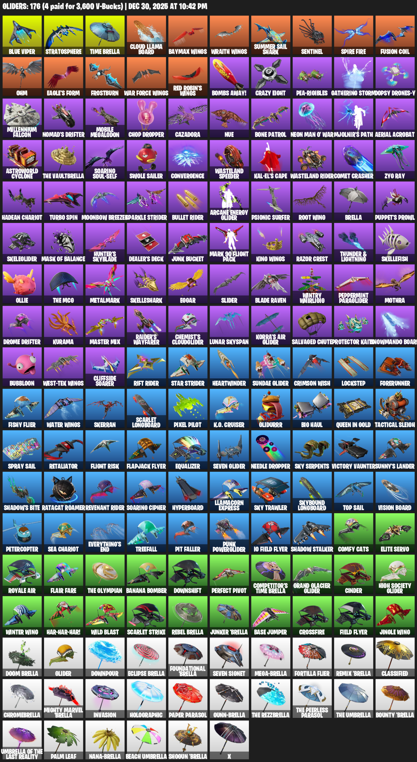 Blue Viper, Stratosphere, Time Brella, Baymax Wings, Summer Sail Shark, Spire Fire, Ohm, Frostburn, Bombs Away!, Crazy Eight, Pea-rigibles, Gathering Storm, Oopsy Drones-y