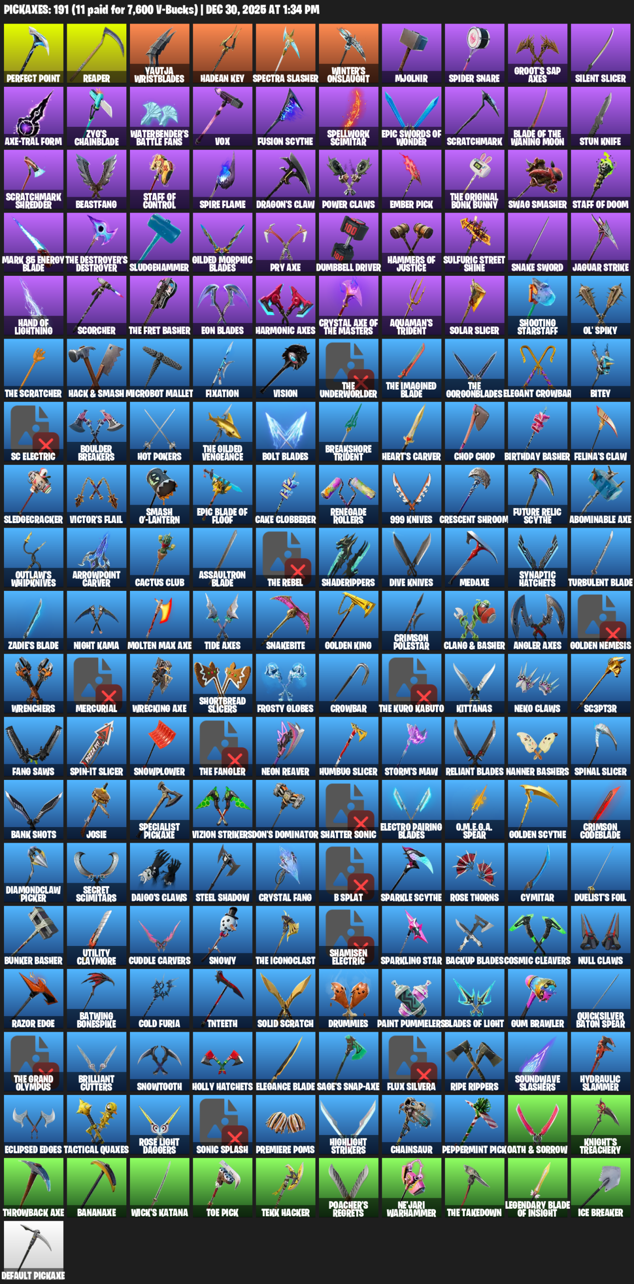 Reaper, Yautja Wristblades, Hadean Key, Spectra Slasher, Winter’s Onslaught, Mjolnir, Spider Snare, Groot’s Sap Axes, Silent Slicer, Axe-tral Form, Zyg’s Chainblade, Waterbender’s Battle Fans, Vox, Fusion Scythe, Spellwork Scimitar, Scratchmark, Blade of the Waning Moon, Stun Knife