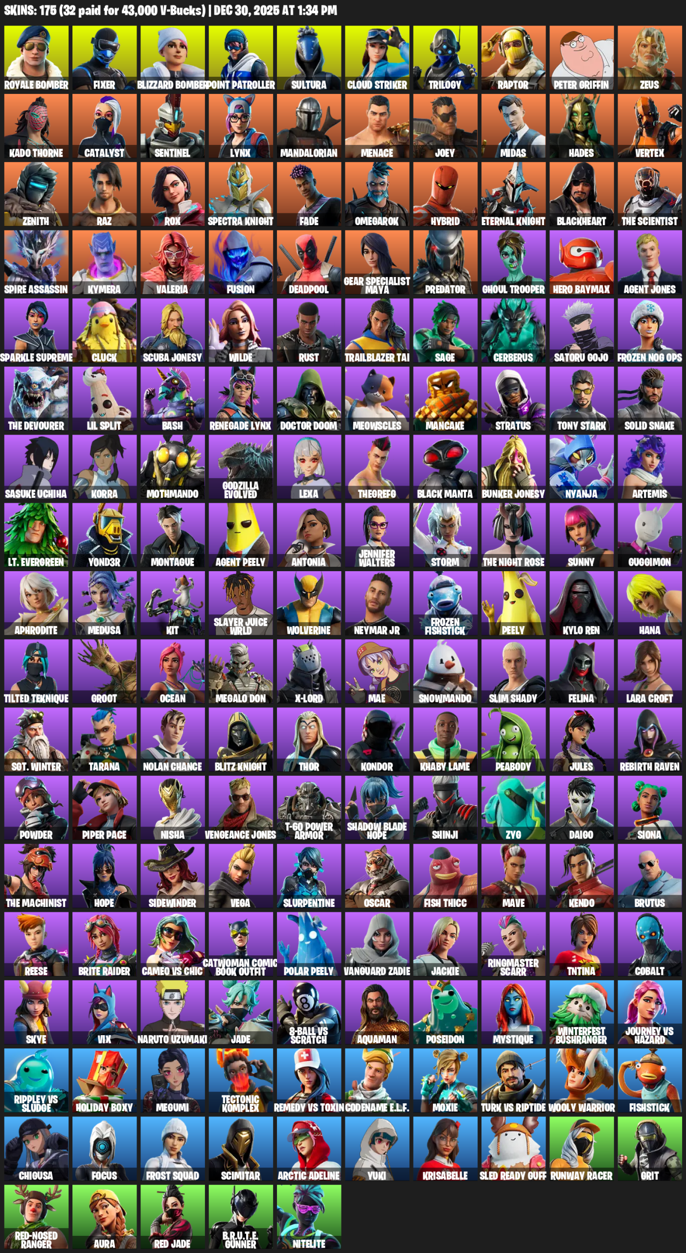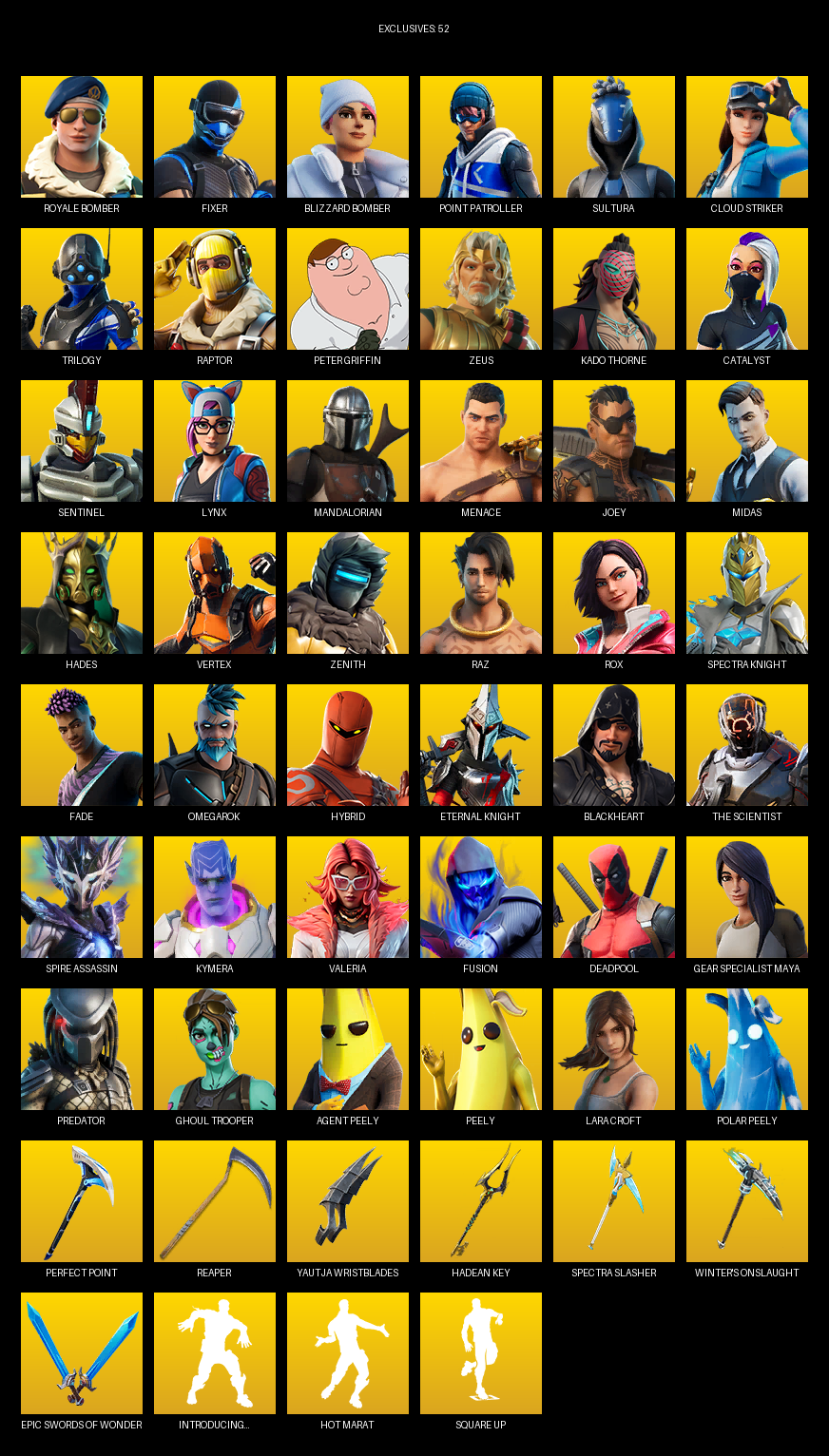 Point Patroller, Gear Specialist Maya, Lara Croft, Royale Bomber, Fixer, Sultura, Cloud Striker, Trilogy, Raptor, Peter Griffin, Zeus, Kado Thorne, Catalyst, Sentinel, Lynx, Mandalorian, Menace, Joey, Midas