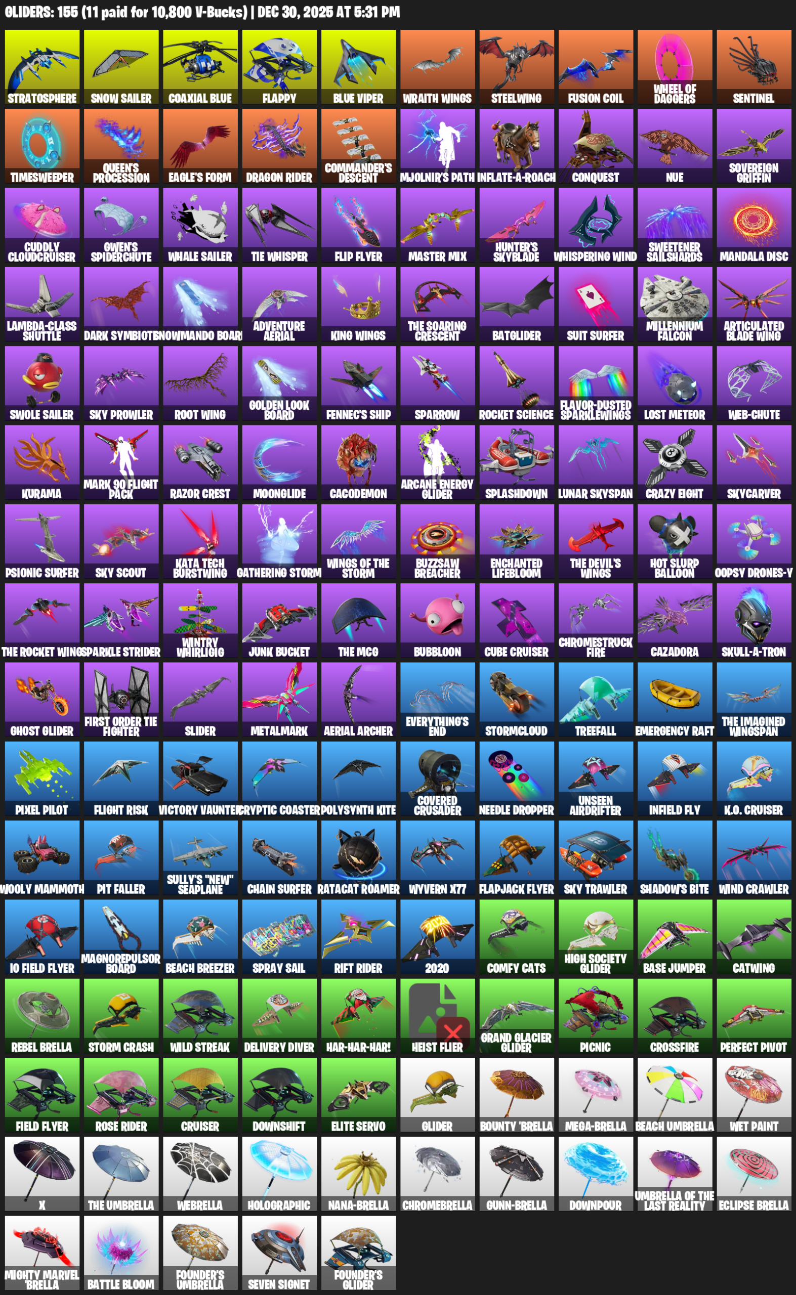 Stratosphere, Snow Sailer, Coaxial Blue, Flappy, Wraith Wings, Steelwing, Fusion Coil, Sentinel, Timesweeper, Queen’s Procession, Eagle’s Form, Dragon Rider, Commander’s Descent, Mjolnir’s Path, Conquest, Nue, Sovereign Griffin