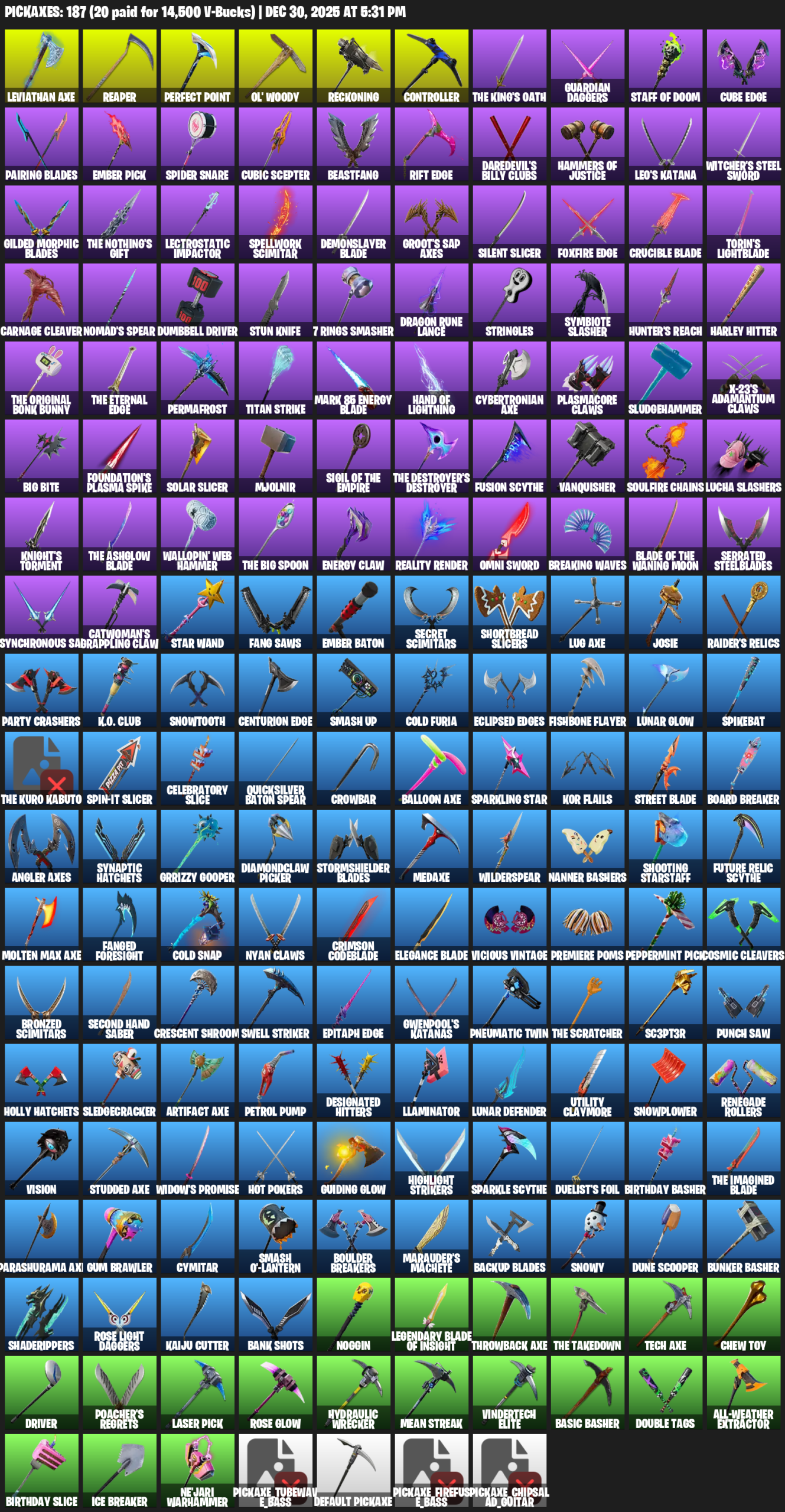 Leviathan Axe, Reaper, Ol’ Woody, Reckoning, Controller, Guardian Daggers, Staff of Doom, Cube Edge, Pairing Blades, Ember Pick, Spider Snare, Cubic Scepter, Beastfang, Daredevil’s Billy Clubs, Leo’s Katana, Witcher’s Steel Sword