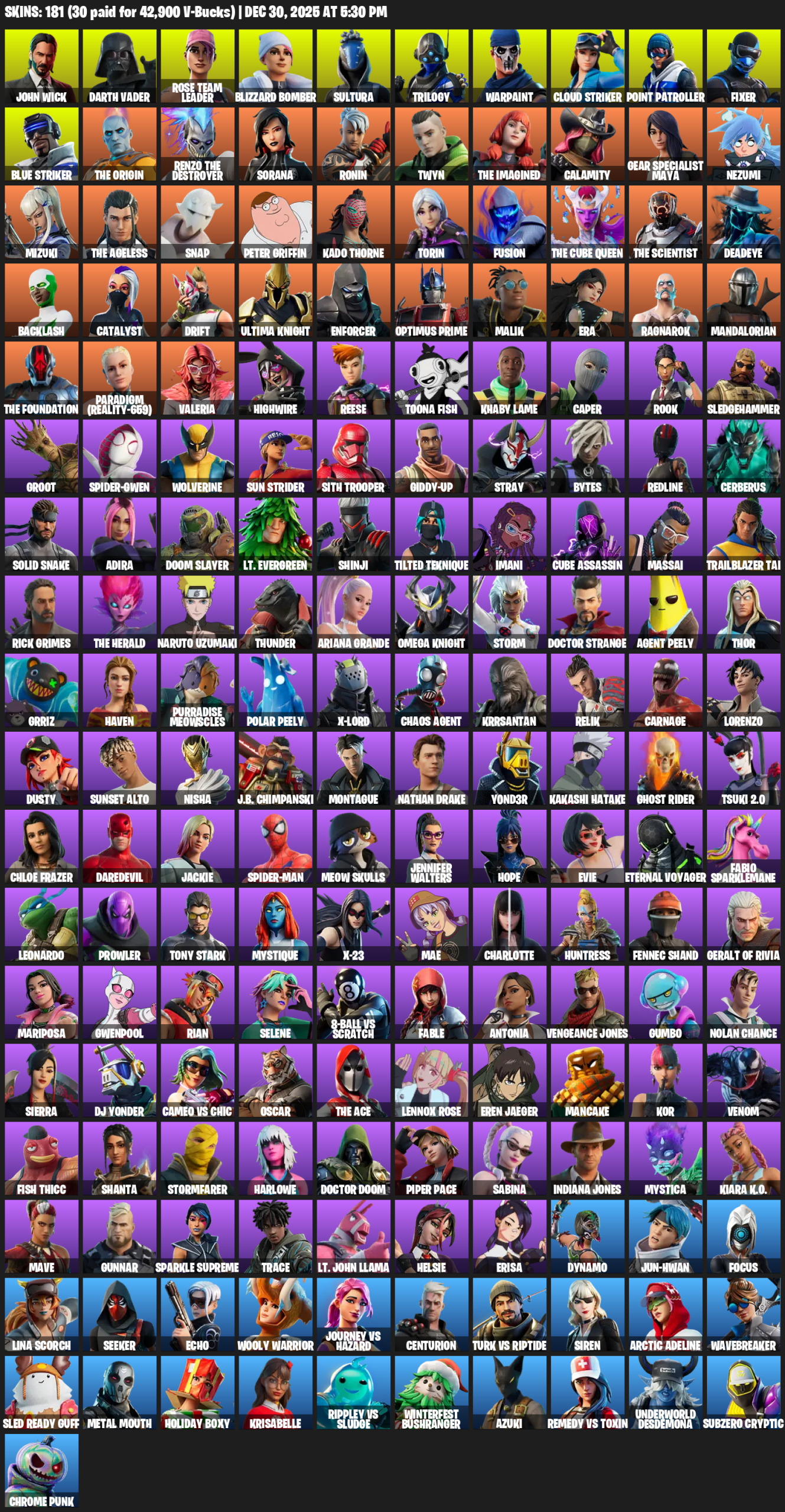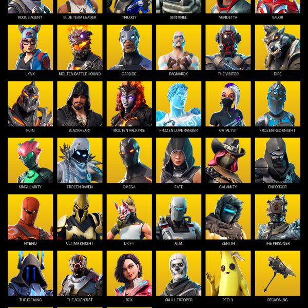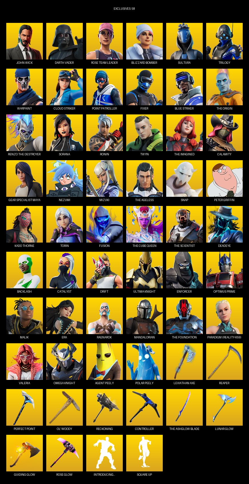 Point Patroller, Gear Specialist Maya, John Wick, Darth Vader, Rose Team Leader, Blizzard Bomber, Sultura, Trilogy, Warpaint, Cloud Striker, Fixer, The Origin, Sorana, Ronin, Twyn, Calamity, Nezumi