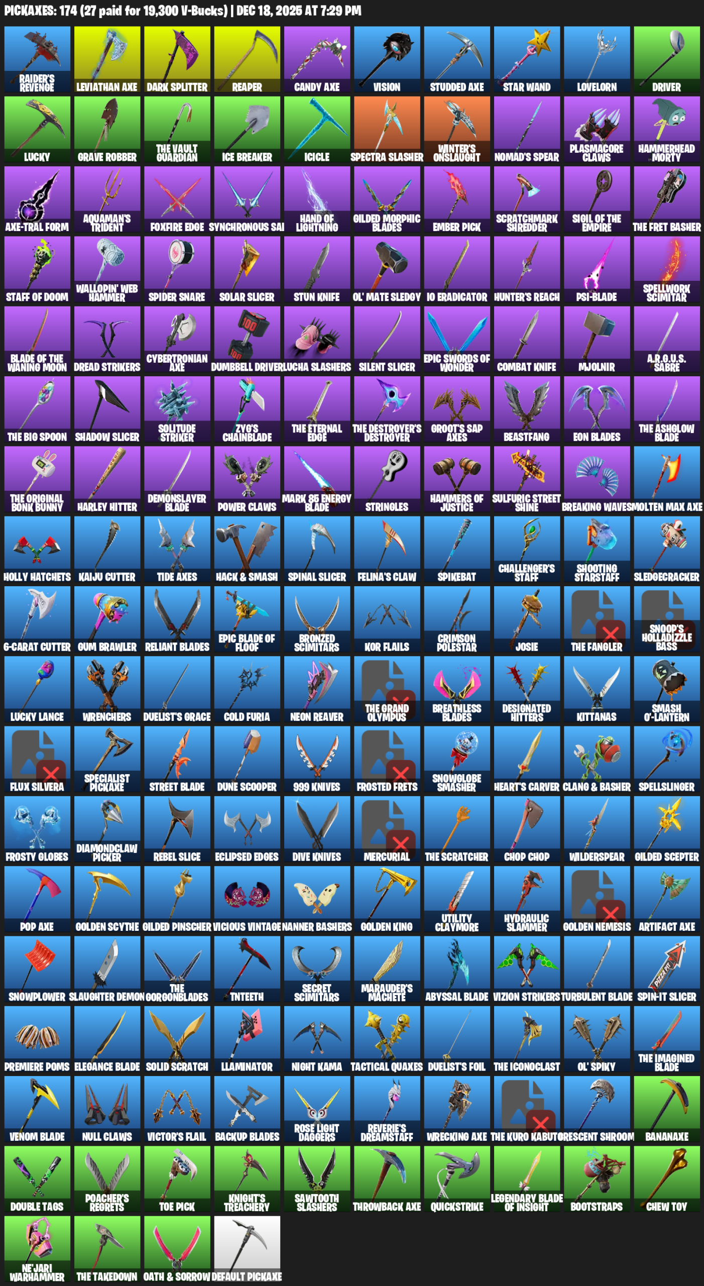 Raider’s Revenge, Leviathan Axe, Reaper, Vision, Star Wand, Lovelorn, Driver, Lucky, Grave Robber, Ice Breaker, Icicle, Spectra Slasher, Winter’s Onslaught, Nomad’s Spear, Plasmacore Claws, Hammerhead Morty
