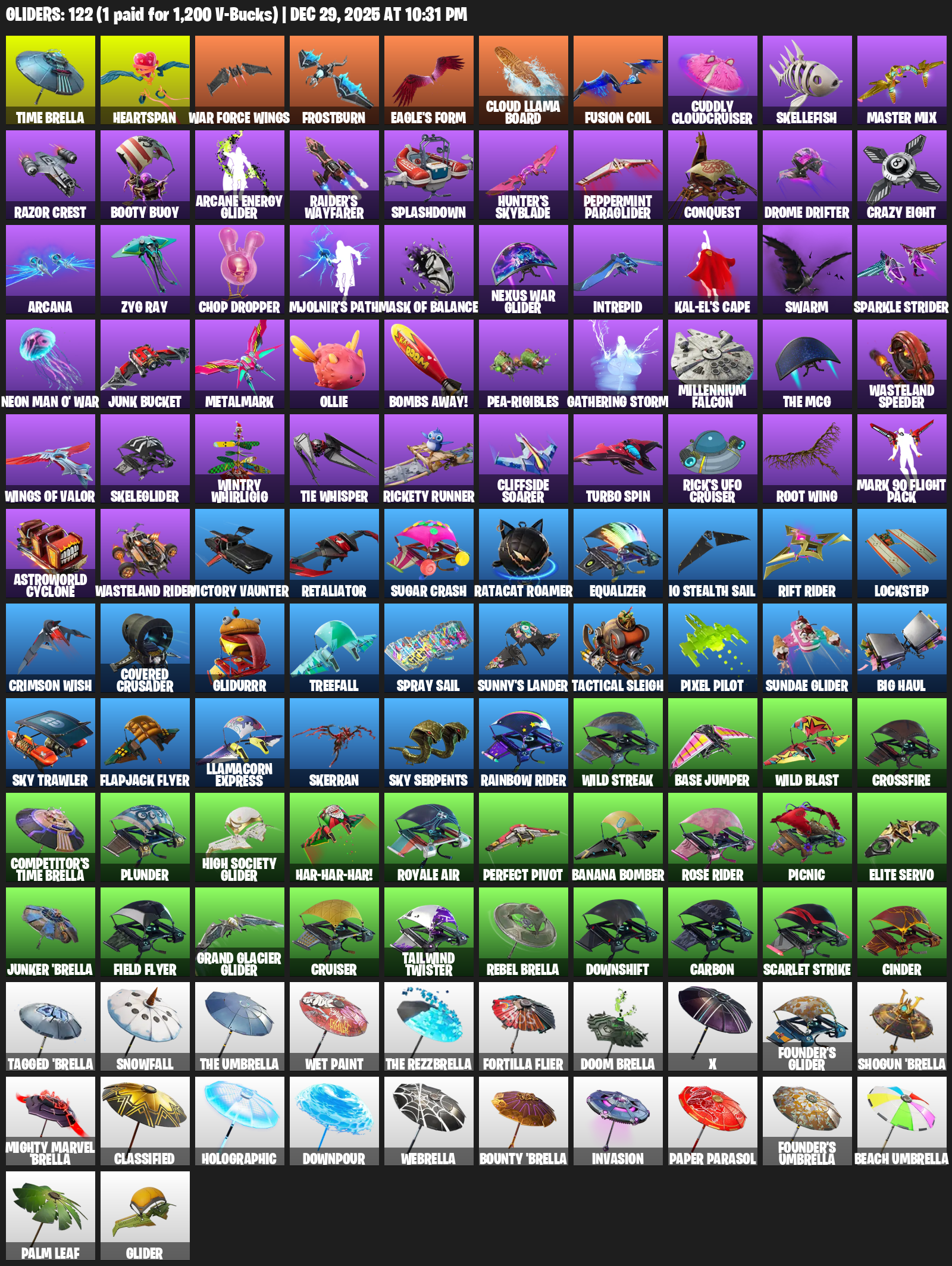Time Brella, Heartspan, War Force Wings, Frostburn, Eagle’s Form, Cloud Llama Board, Cuddly Cloudcruiser, Skellefish, Master Mix, Razor Crest, Booty Buoy, Raider’s Wayfarer, Splashdown, Hunter’s Skyblade, Peppermint Paraglider, Conquest, Drome Drifter, Crazy Eight