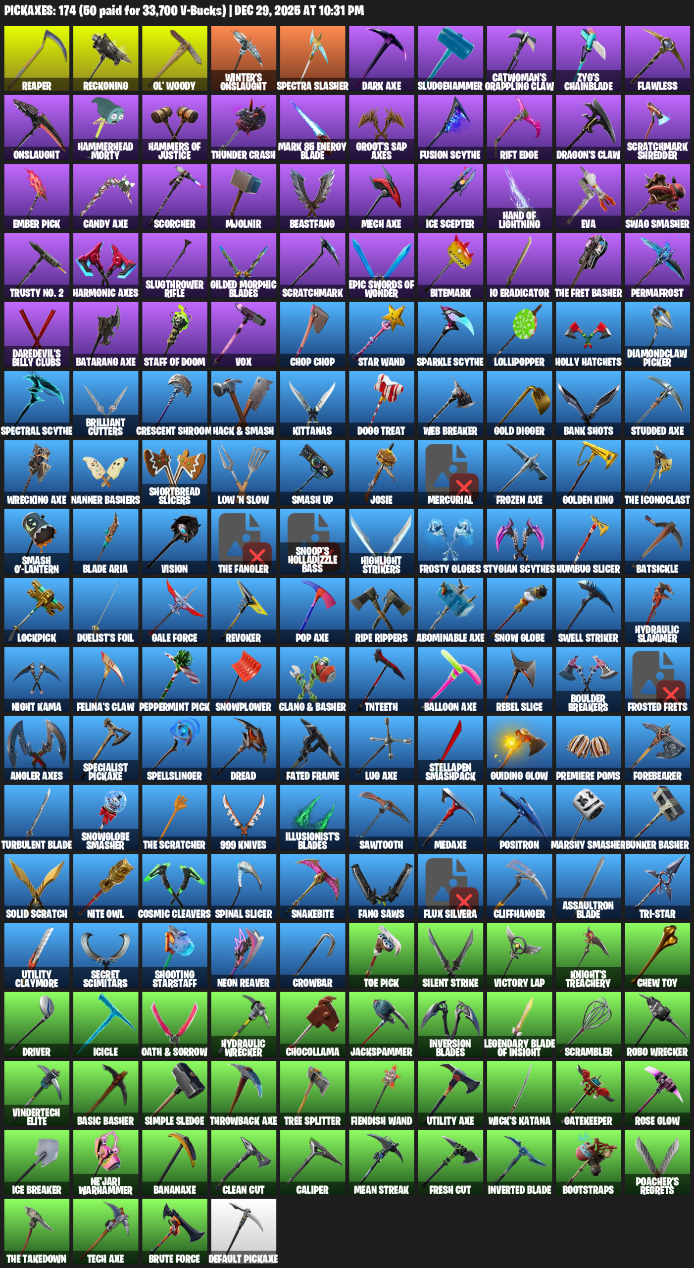 Reckoning, Ol’ Woody, Winter’s Onslaught, Spectra Slasher, Sludgehammer, Catwoman’s Grappling Claw, Zyg’s Chainblade, Flawless, Hammerhead Morty, Hammers of Justice, Thunder Crash, Mark 85 Energy Blade, Groot’s Sap Axes, Rift Edge, Scratchmark Shredder
