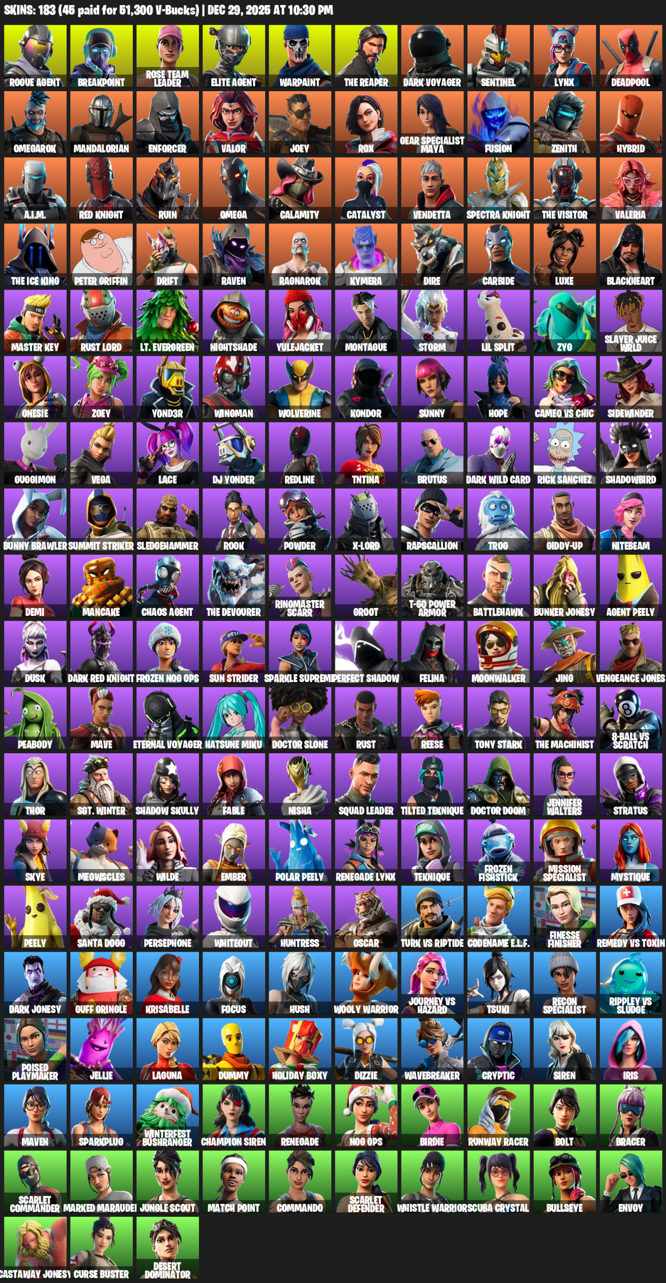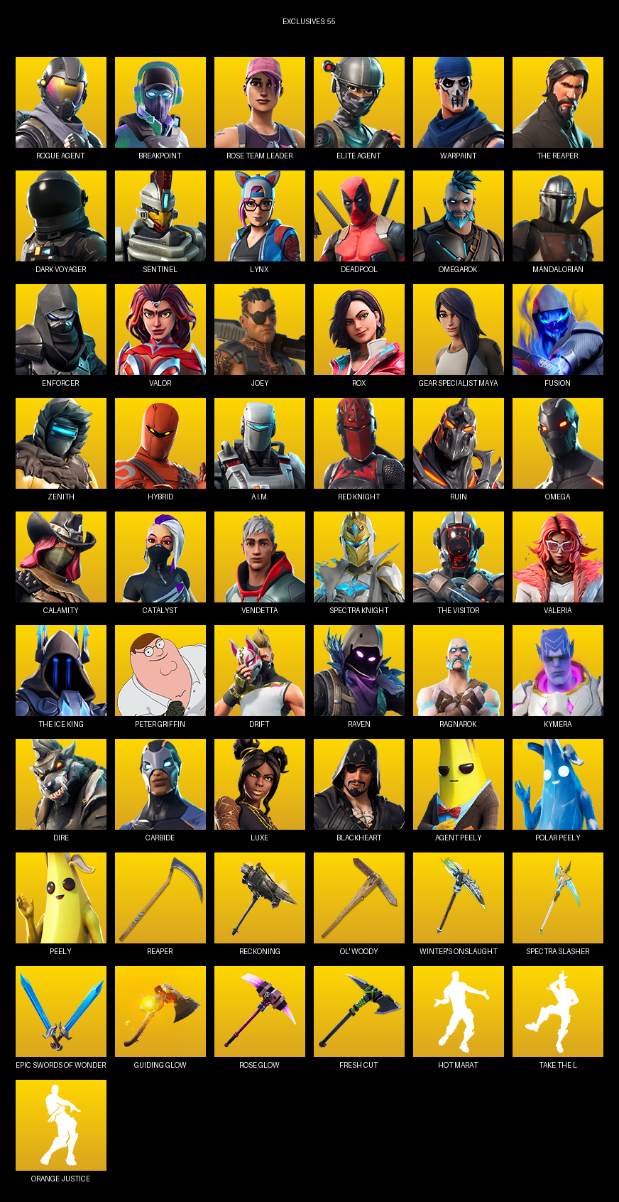 Elite Agent, The Reaper, Gear Specialist Maya, Omega, Breakpoint, Rose Team Leader, Warpaint, Dark Voyager, Sentinel, Lynx, Deadpool, Omegarok, Mandalorian, Enforcer, Valor, Joey, Rox, Fusion, Zenith
