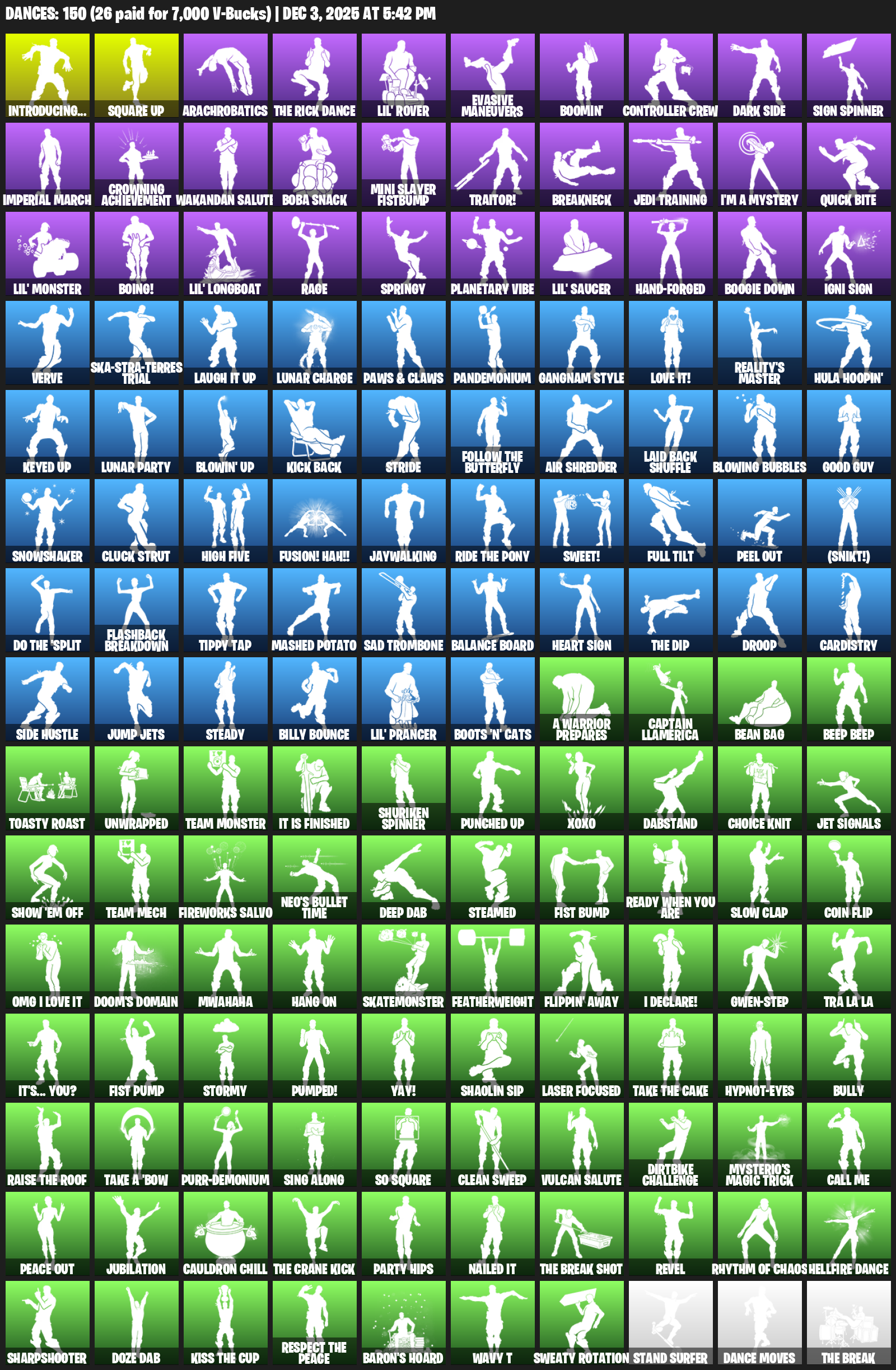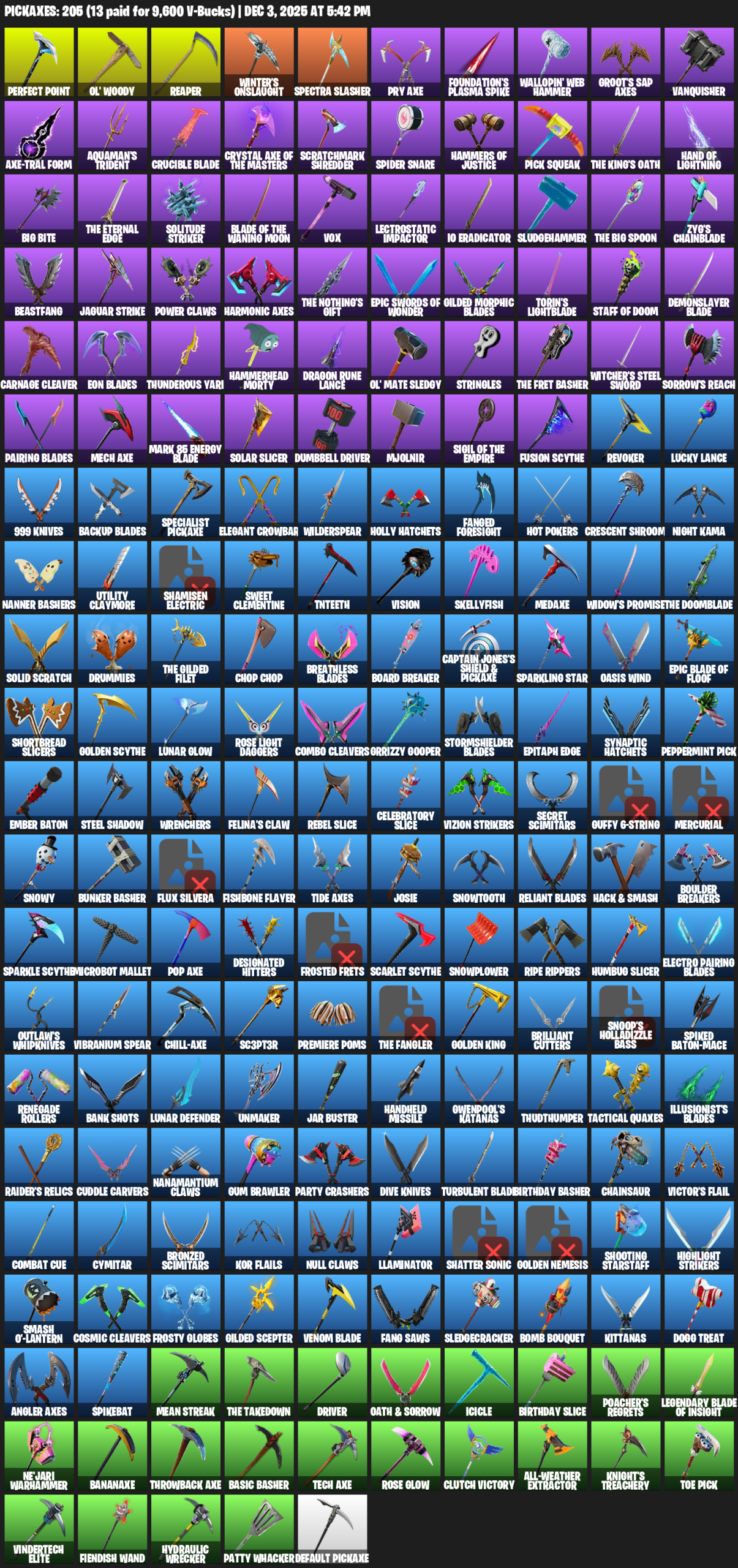 Perfect Point, Ol’ Woody, Reaper, Winter’s Onslaught, Spectra Slasher, Pry Axe, Foundation’s Plasma Spike, Wallopin’ Web Hammer, Groot’s Sap Axes, Vanquisher, Aquaman’s Trident, Crucible Blade, Scratchmark Shredder, Spider Snare, Hammers of Justice, Pick Squeak, The King’s Oath