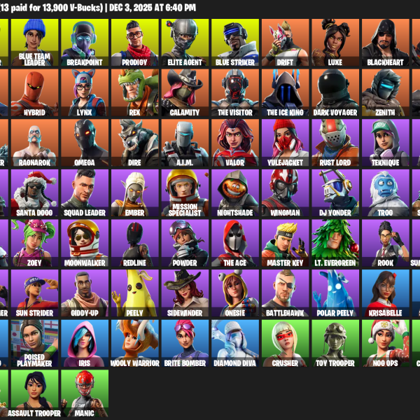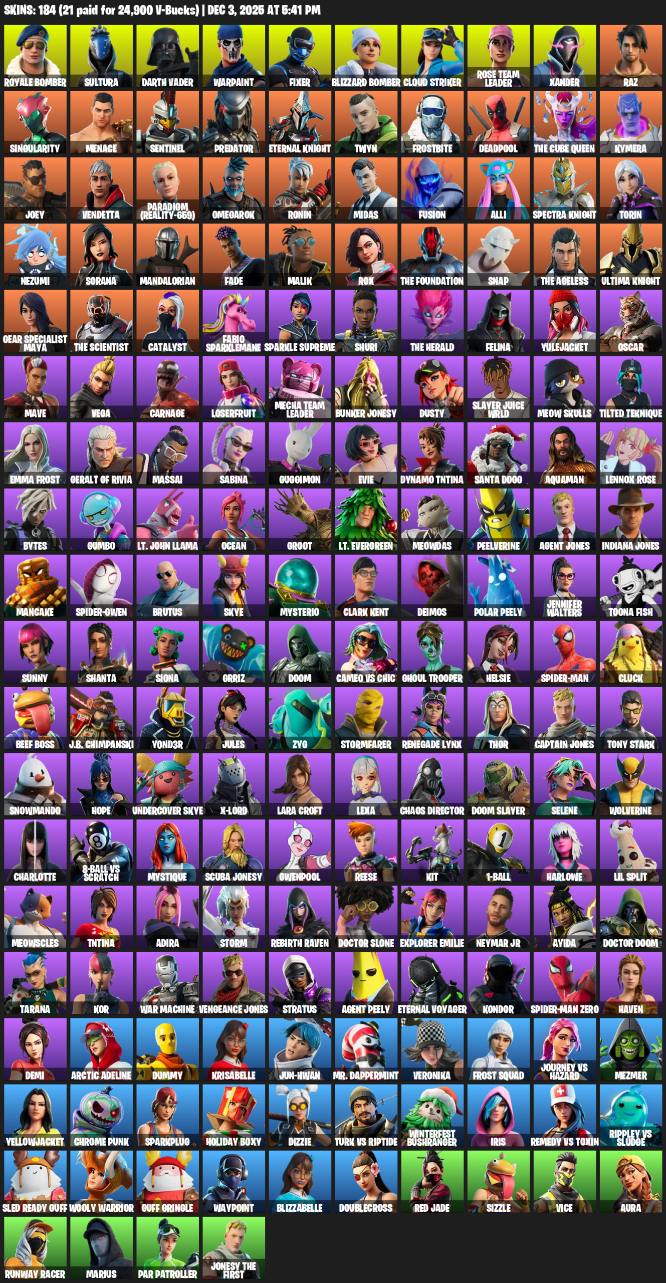 Gear Specialist Maya, Lara Croft, Royale Bomber, Sultura, Darth Vader, Warpaint, Fixer, Cloud Striker, Rose Team Leader, Xander, Raz, Singularity, Menace, Sentinel, Predator, Eternal Knight, Twyn, Frostbite, Deadpool