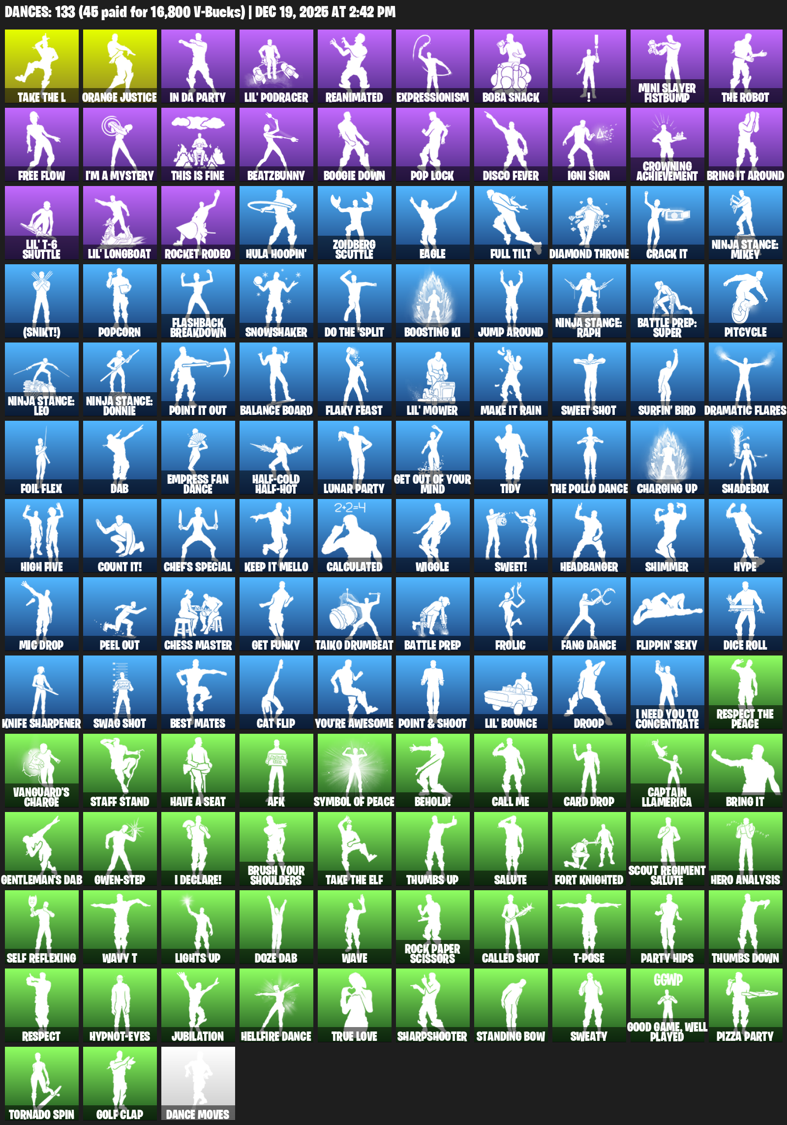 Orange Justice, In Da Party, Lil’ Podracer, Reanimated, Expressionism, Boba Snack, !, Mini Slayer Fistbump, Free Flow, I’m a Mystery, This is Fine, BeatzBunny, Boogie Down, Pop Lock, Disco Fever, Igni Sign, Crowning Achievement, Bring it around