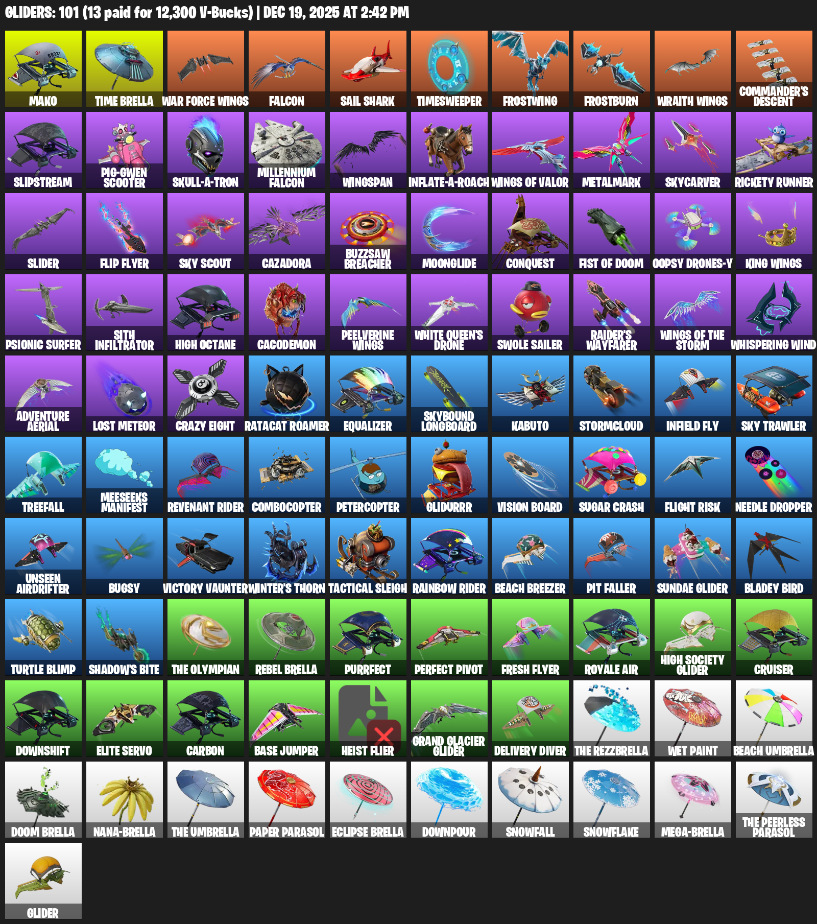 Mako, Time Brella, Falcon, Sail Shark, Timesweeper, Frostwing, Frostburn, Wraith Wings, Commander’s Descent, Slipstream, Pig-Gwen Scooter, Wingspan, Metalmark, Skycarver, Rickety Runner