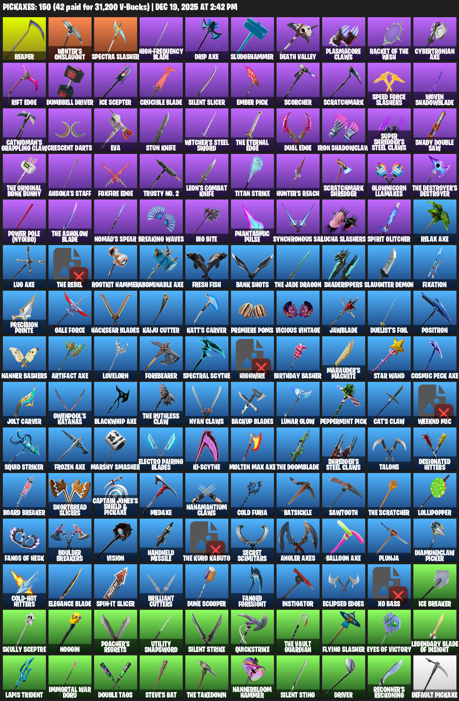 Winter’s Onslaught, Spectra Slasher, High-frequency Blade, Drip Axe, Sludgehammer, Death Valley, Plasmacore Claws, Rift Edge, Dumbbell Driver, Ice Scepter, Silent Slicer, Ember Pick, Scorcher, Scratchmark, Speed Force Slashers, Woven Shadowblade