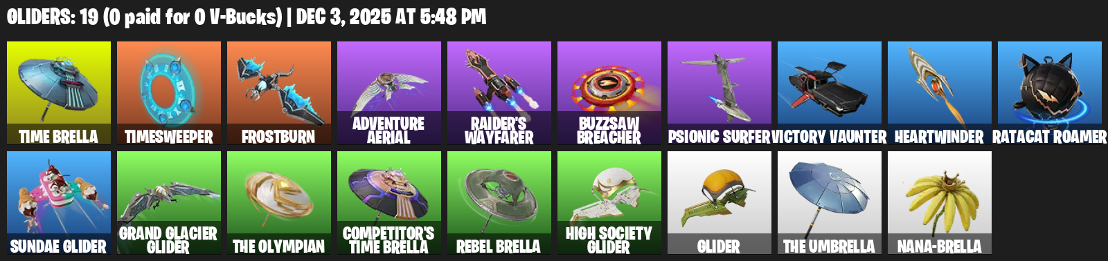 Time Brella, Timesweeper, Frostburn, Adventure Aerial, Raider’s Wayfarer, Buzzsaw Breacher, Psionic Surfer, Victory Vaunter, Heartwinder, Ratacat Roamer, Sundae Glider