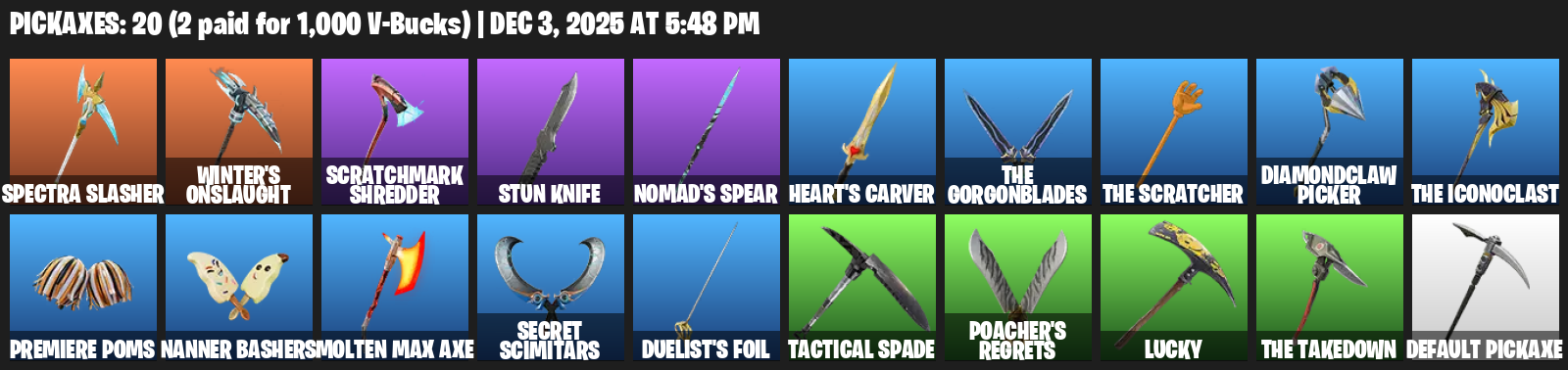 Winter’s Onslaught, Scratchmark Shredder, Stun Knife, Nomad’s Spear, Heart’s Carver, Diamondclaw Picker, Premiere Poms, Nanner Bashers, Molten Max Axe, Secret Scimitars, Duelist’s Foil, Tactical Spade, Poacher’s Regrets, Lucky, Default Pickaxe