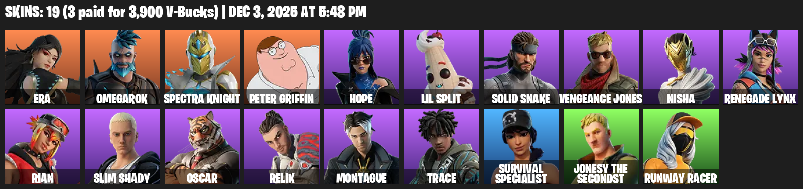 HomeFortnite AccountsOmegarok [PC/PSN/XBOX] | 19 skins | Era | Omegarok | Spectra Knight | Peter Griffin | Hope | Lil Split | Solid Snake | Vengeance Jones | Nisha | #AUY0856