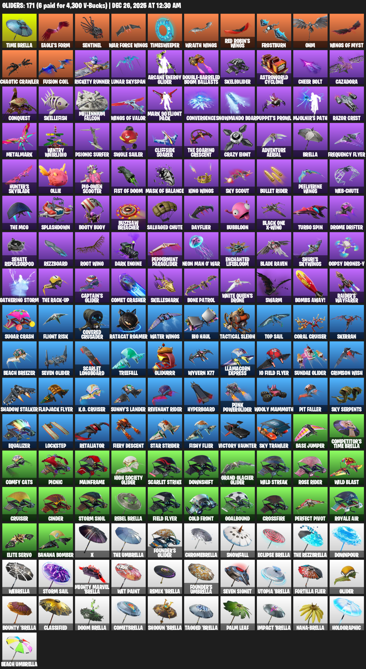 Time Brella, Eagle’s Form, War Force Wings, Timesweeper, Frostburn, Ohm, Chaotic Crawler, Rickety Runner, Lunar Skyspan, Arcane Energy Glider, Double-Barreled Boom Ballasts, Skeleglider, Astroworld Cyclone, Cheer Bolt, Cazadora