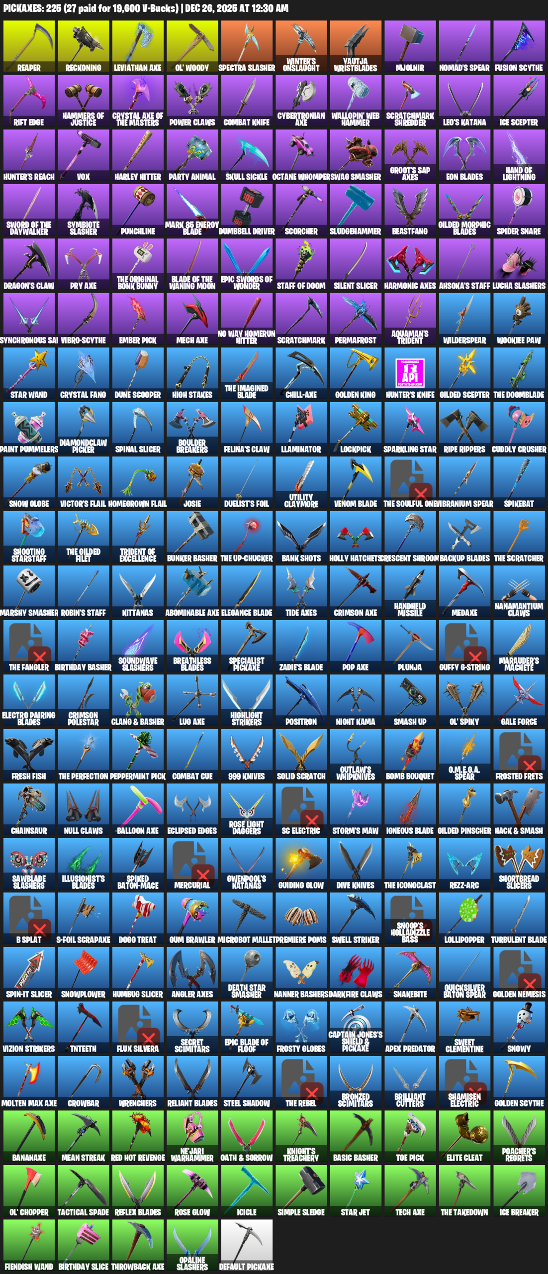 Leviathan Axe, Reaper, Reckoning, Ol’ Woody, Spectra Slasher, Winter’s Onslaught, Yautja Wristblades, Mjolnir, Nomad’s Spear, Fusion Scythe, Rift Edge, Hammers of Justice, Power Claws, Combat Knife, Wallopin’ Web Hammer, Scratchmark Shredder, Leo’s Katana, Ice Scepter