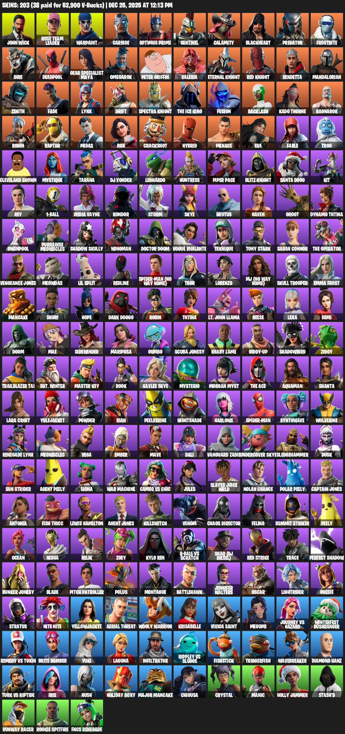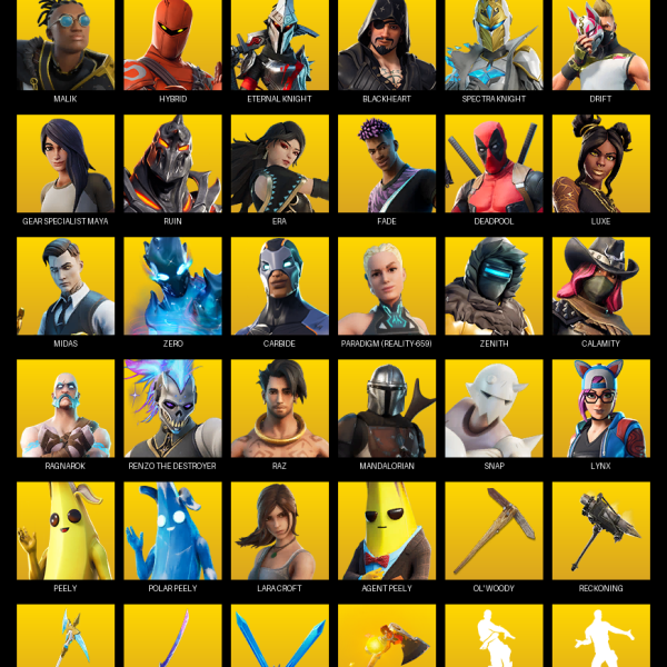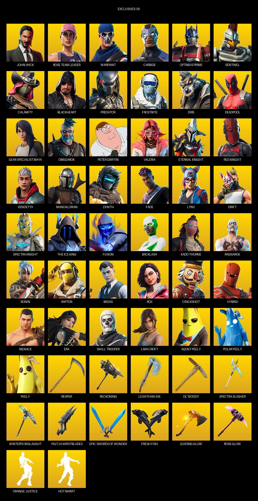Gear Specialist Maya, Lara Croft, John Wick, Rose Team Leader, Warpaint, Carbide, Optimus Prime, Sentinel, Calamity, Blackheart, Predator, Frostbite, Dire, Deadpool, Omegarok, Peter Griffin, Valeria, Eternal Knight, Vendetta