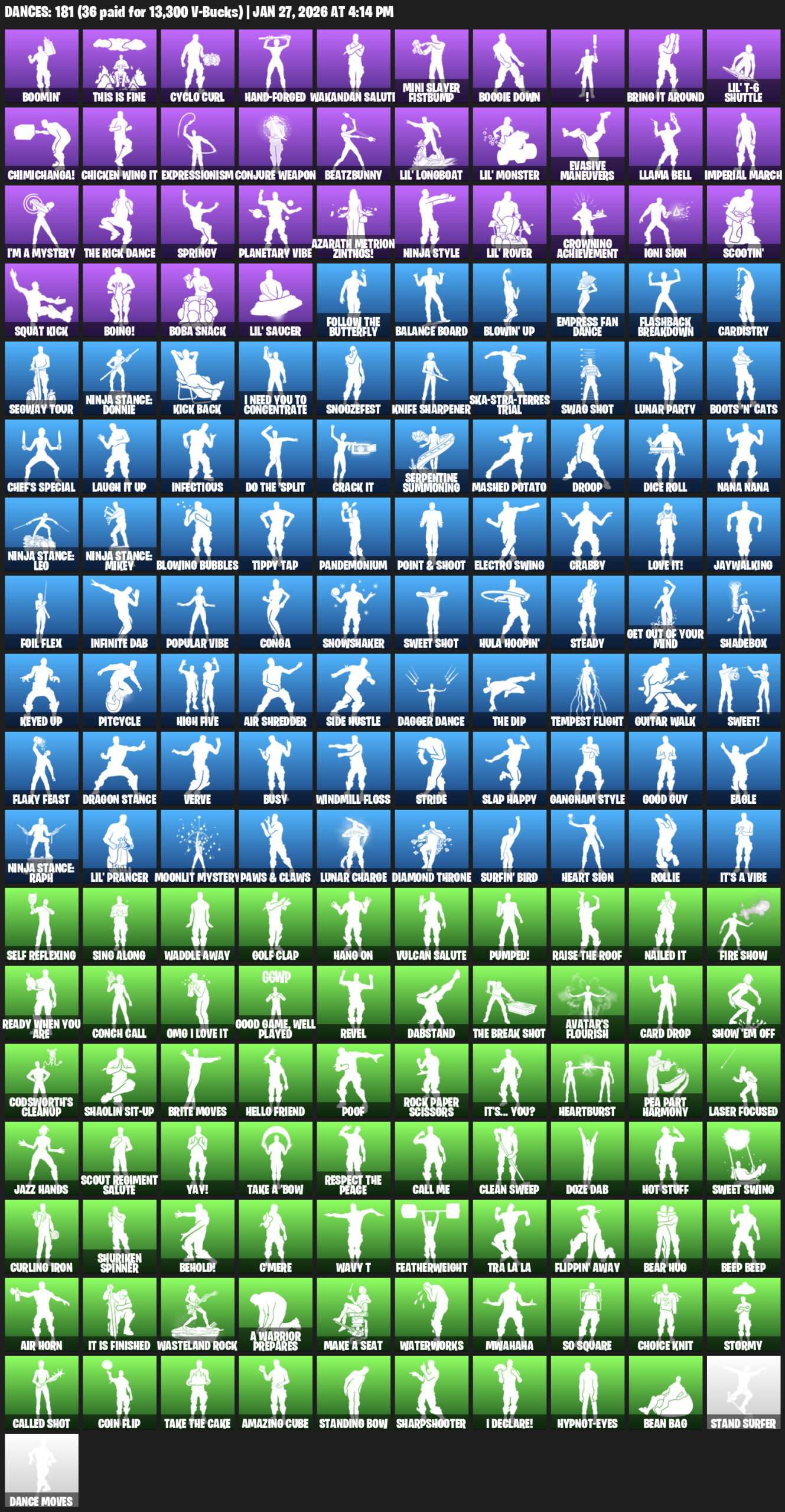 Boomin’, This is Fine, Cyclo Curl, Wakandan Salute, Mini Slayer Fistbump, Boogie Down, !, Bring it around, Lil’ T-6 Shuttle, Chimichanga!, Expressionism, Conjure Weapon, BeatzBunny, Evasive Maneuvers, Llama Bell, Imperial March