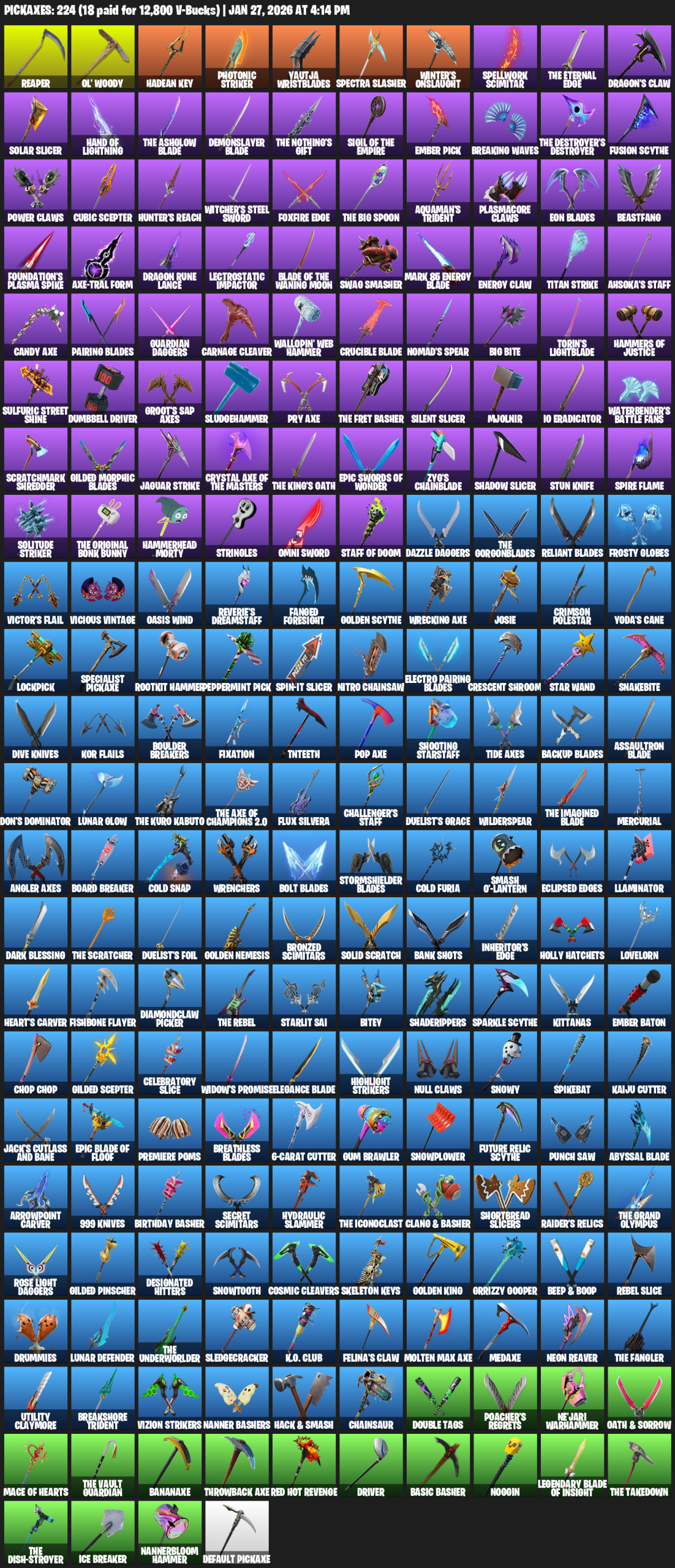 Reaper, Ol’ Woody, Hadean Key, Photonic Striker, Yautja Wristblades, Spectra Slasher, Winter’s Onslaught, Spellwork Scimitar, Dragon’s Claw, Solar Slicer, Hand of Lightning, Demonslayer Blade, Ember Pick, Breaking Waves