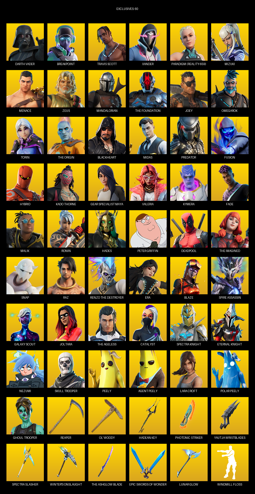 Travis Scott, Gear Specialist Maya, Lara Croft, Darth Vader, Breakpoint, Xander, Paradigm (Reality-659), Mizuki, Menace, Zeus, Mandalorian, The Foundation, Joey, Omegarok, Torin, Blackheart, Midas, Predator, Fusion