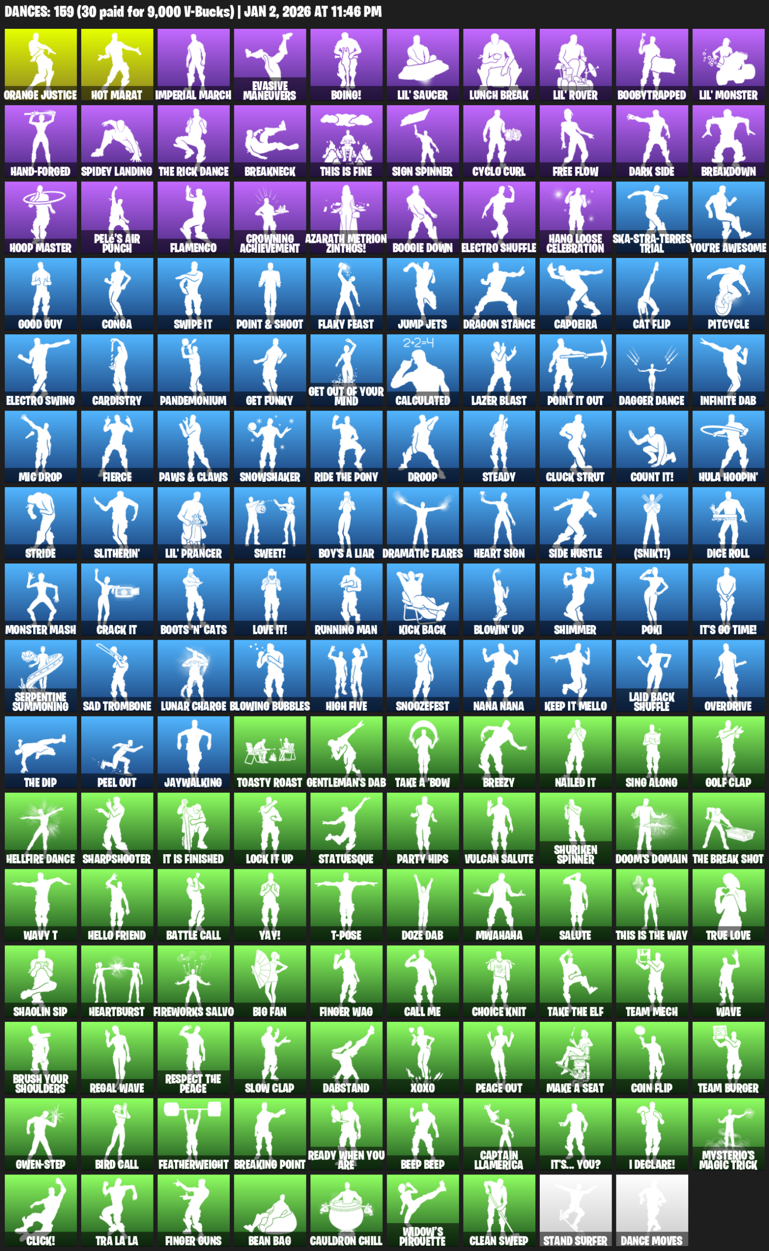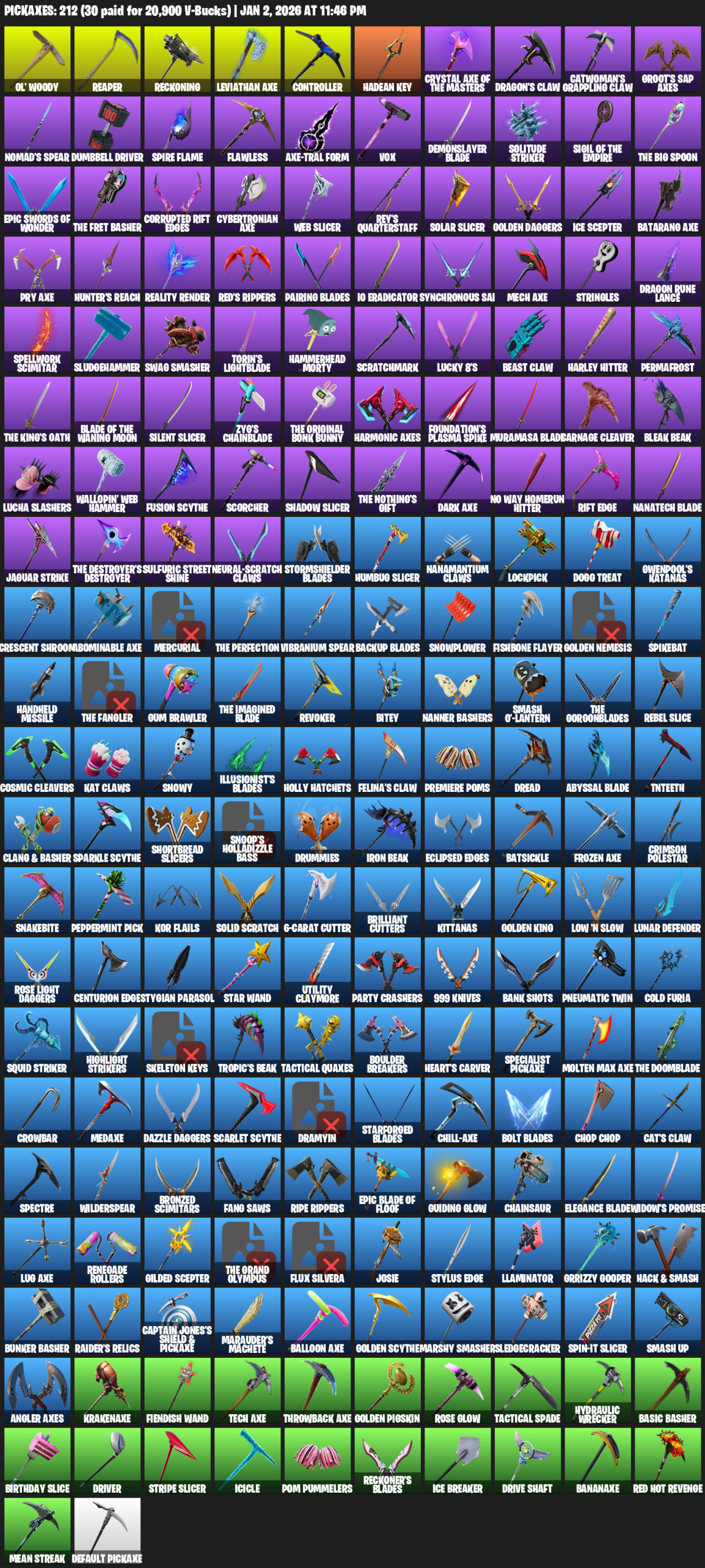 Leviathan Axe, Ol’ Woody, Reaper, Reckoning, Controller, Hadean Key, Dragon’s Claw, Groot’s Sap Axes, Nomad’s Spear, Dumbbell Driver, Spire Flame, Flawless, Vox, Demonslayer Blade