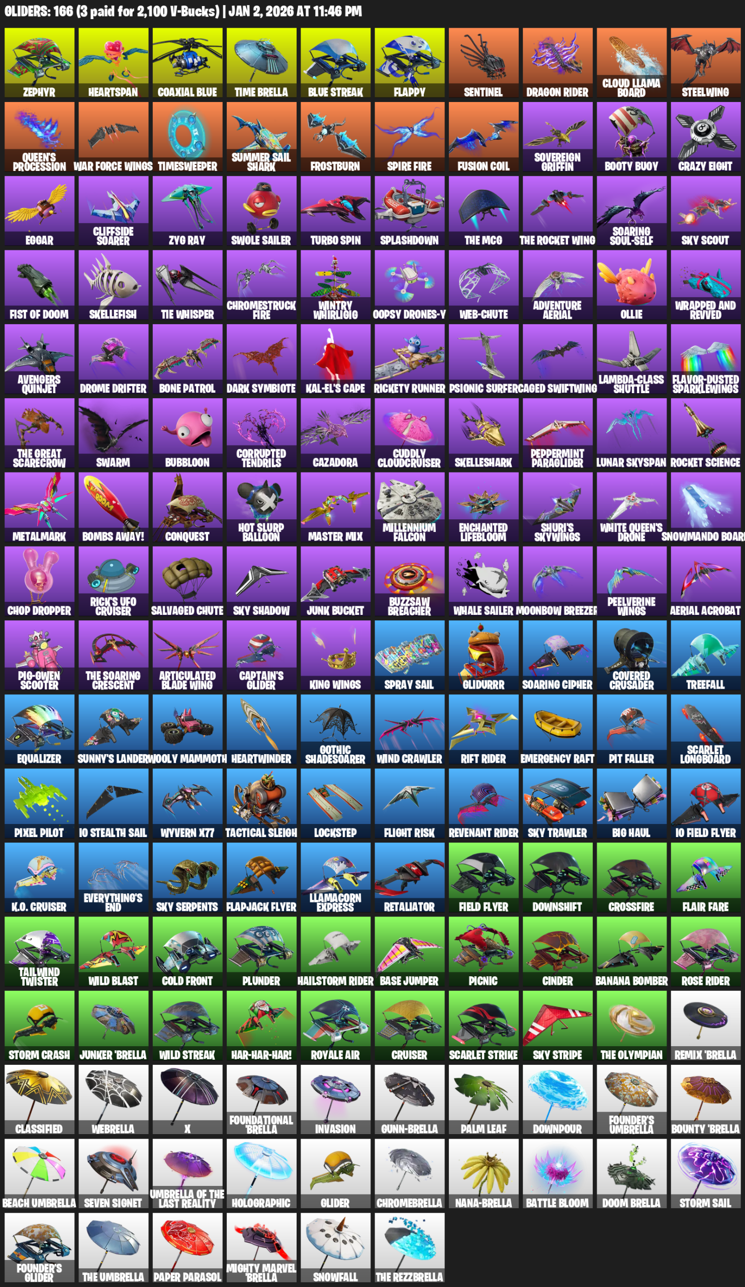 Zephyr, Heartspan, Time Brella, Flappy, Dragon Rider, Cloud Llama Board, Steelwing, Queen’s Procession, War Force Wings, Timesweeper, Summer Sail Shark, Frostburn, Fusion Coil, Sovereign Griffin, Booty Buoy, Crazy Eight