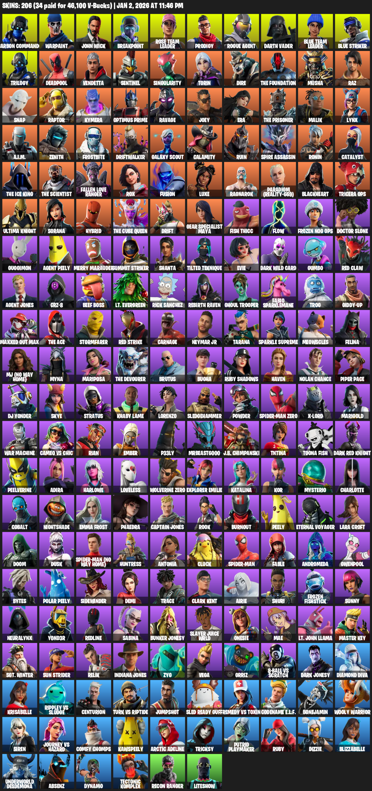 Gear Specialist Maya, Lara Croft, Carbon Commando, Warpaint, John Wick, Breakpoint, Rose Team Leader, Prodigy, Rogue Agent, Darth Vader, Blue Striker, Trilogy, Deadpool, Vendetta, Sentinel, Singularity, Torin, Dire, The Foundation
