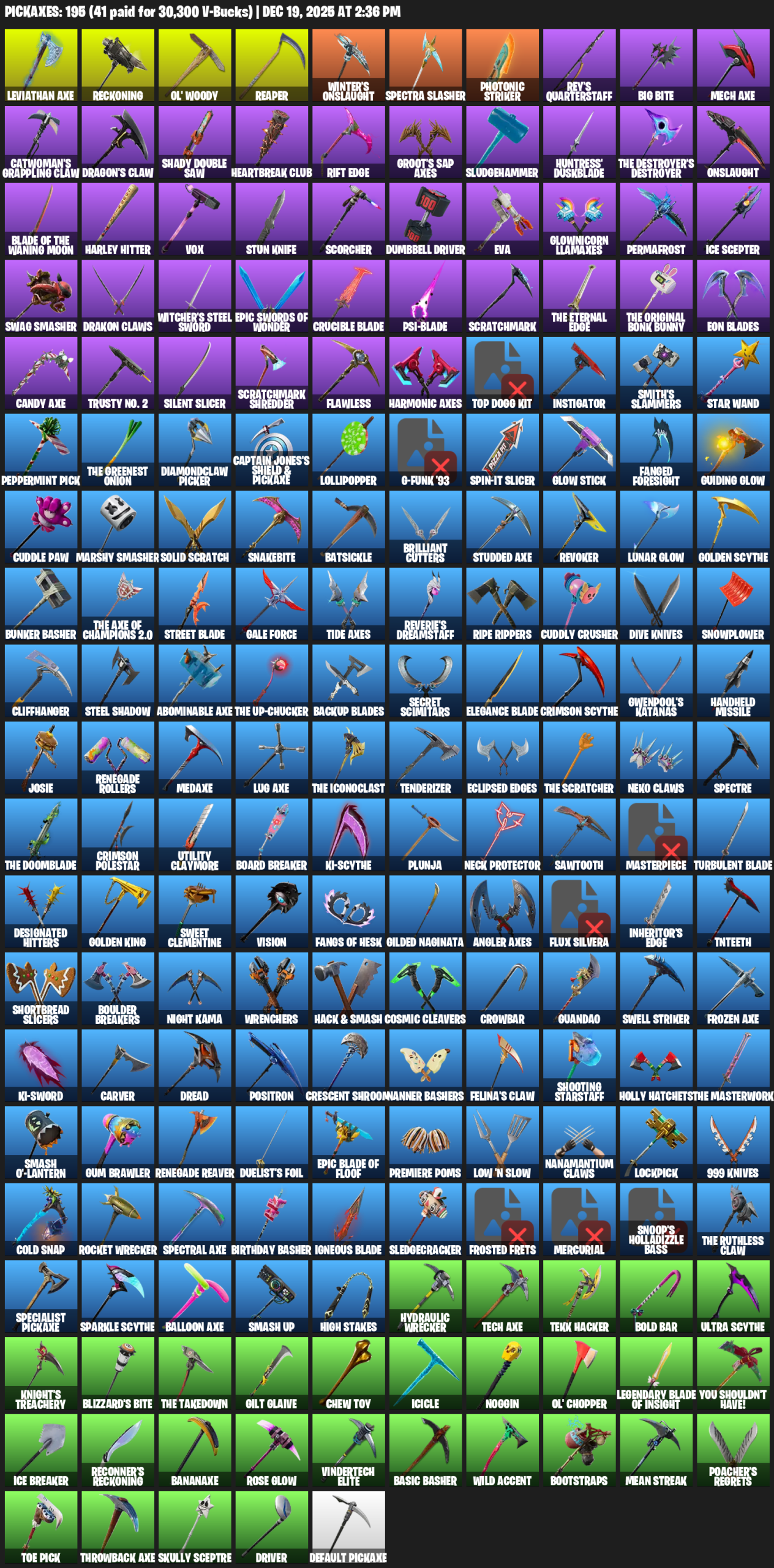 Leviathan Axe, Reckoning, Ol’ Woody, Winter’s Onslaught, Rey’s Quarterstaff, Big Bite, Catwoman’s Grappling Claw, Shady Double Saw, Heartbreak Club, Rift Edge, Groot’s Sap Axes, Sludgehammer, Huntress’ Duskblade