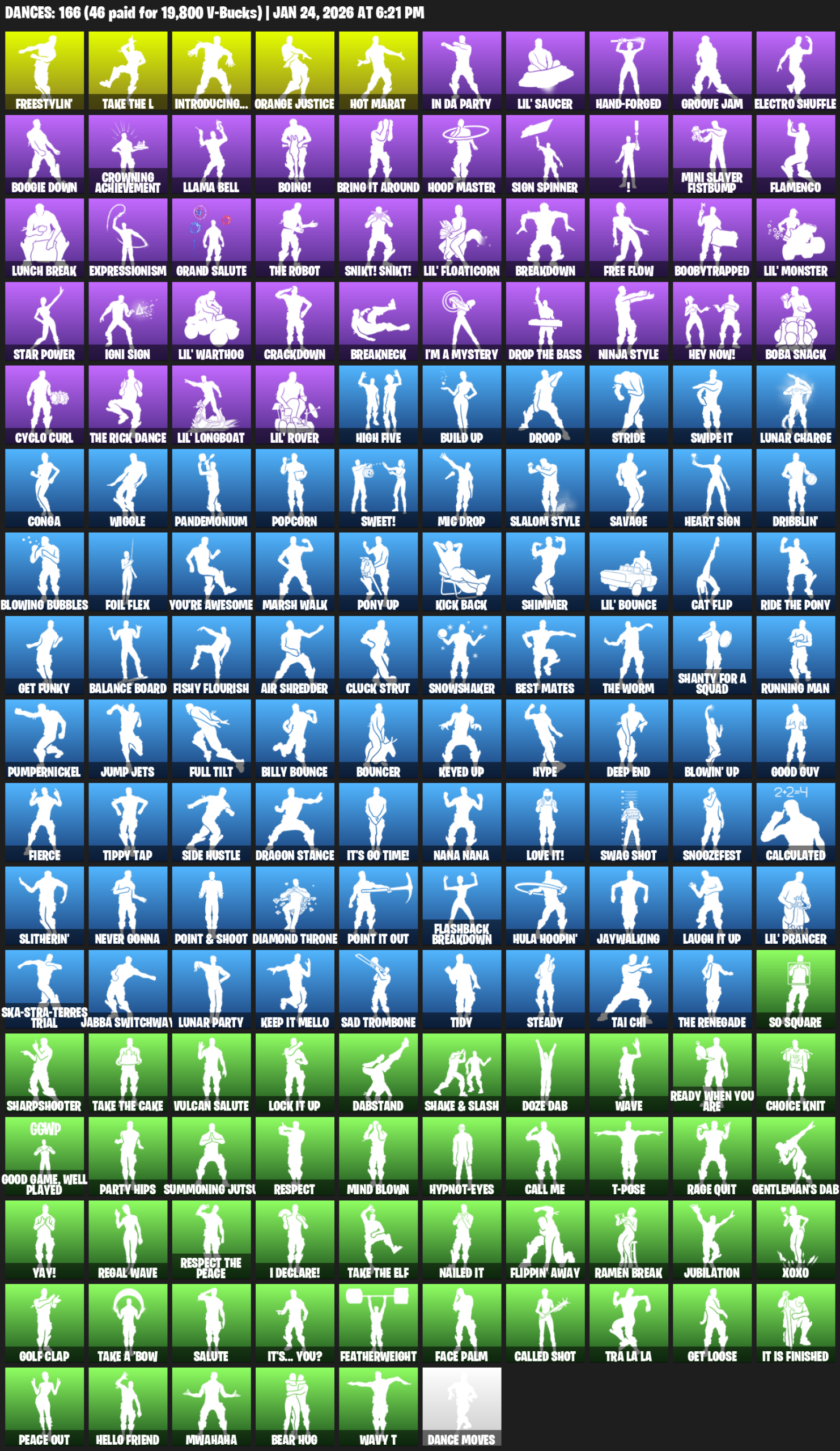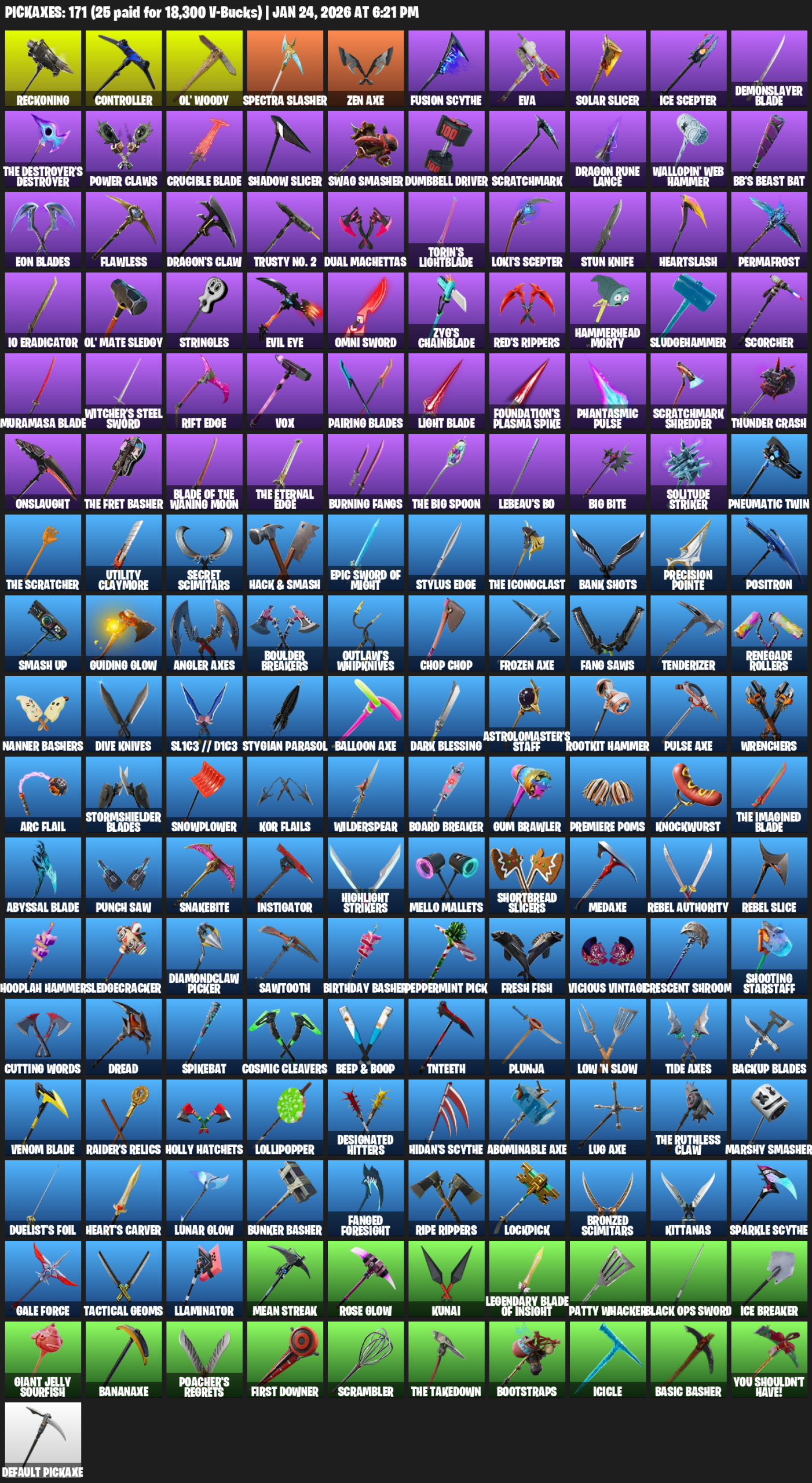 Reckoning, Controller, Ol’ Woody, Spectra Slasher, Zen Axe, Fusion Scythe, EVA, Solar Slicer, Ice Scepter, Demonslayer Blade, Power Claws, Swag Smasher, Dumbbell Driver, Scratchmark, Dragon Rune Lance, Wallopin’ Web Hammer, BB’s Beast Bat
