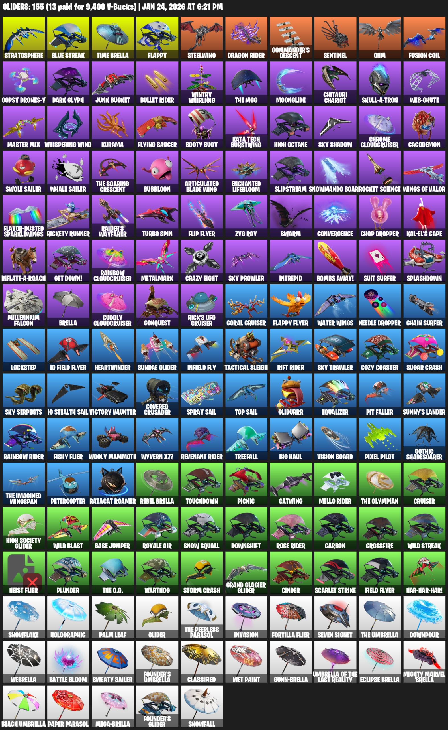 Stratosphere, Time Brella, Flappy, Steelwing, Commander’s Descent, Sentinel, Ohm, Oopsy Drones-y, Dark Glyph, Junk Bucket, Bullet Rider, Wintry Whirligig, Moonglide, Chitauri Chariot, Skull-a-tron
