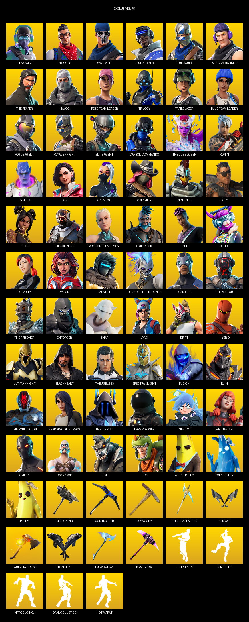 Blue Squire, The Reaper, Royale Knight, Elite Agent, Gear Specialist Maya, Omega, Breakpoint, Prodigy, Warpaint, Sub Commander, Havoc, Rose Team Leader, Trilogy, Trailblazer, Carbon Commando, Ronin