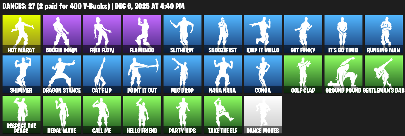 Hot Marat, Boogie Down, Free Flow, Flamenco, Slitherin’, Snoozefest, Keep It Mello, Get Funky, It’s Go Time!, Running Man, Shimmer, Dragon Stance, Cat Flip, Mic Drop, Nana Nana, Conga, Golf Clap, Ground Pound, Gentleman’s Dab
