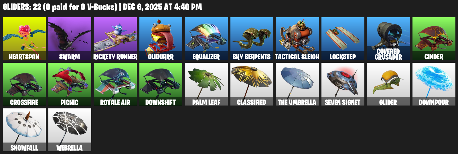 Heartspan, Swarm, Rickety Runner, Glidurrr, Equalizer, Sky Serpents, Tactical Sleigh, Lockstep, Covered Crusader, Cinder, Crossfire, Picnic, Royale Air, Downshift, Palm Leaf, CLASSIFIED, Seven Signet, Glider, Downpour