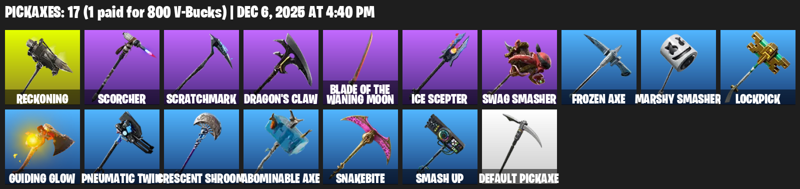 Reckoning, Scorcher, Scratchmark, Dragon’s Claw, Ice Scepter, Swag Smasher, Frozen Axe, Lockpick, Guiding Glow, Pneumatic Twin, Crescent Shroom, Snakebite, Default Pickaxe