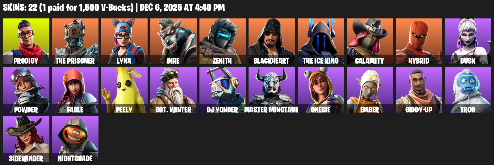 Prodigy, The Prisoner, Lynx, Dire, Zenith, Blackheart, Calamity, Hybrid, Dusk, Powder, Fable, Peely, Sgt. Winter, DJ Yonder, Master Minotaur, Onesie, Ember, Giddy-up, Trog