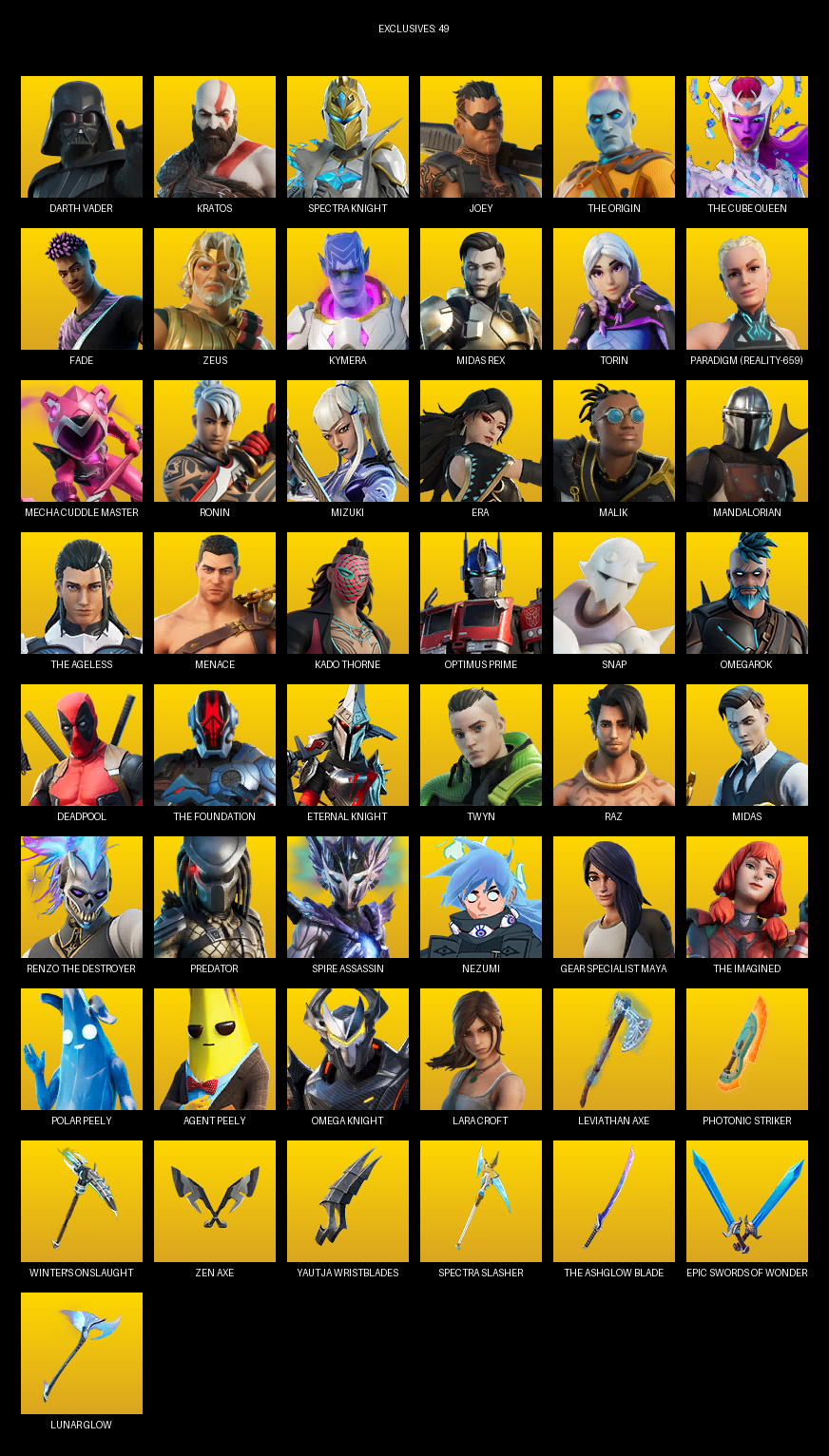 Gear Specialist Maya, Lara Croft, Darth Vader, Kratos, Spectra Knight, Joey, The Origin, Fade, Zeus, Kymera, Midas Rex, Torin, Paradigm (Reality-659), Mecha Cuddle Master, Ronin, Mizuki, Era, Malik, Mandalorian