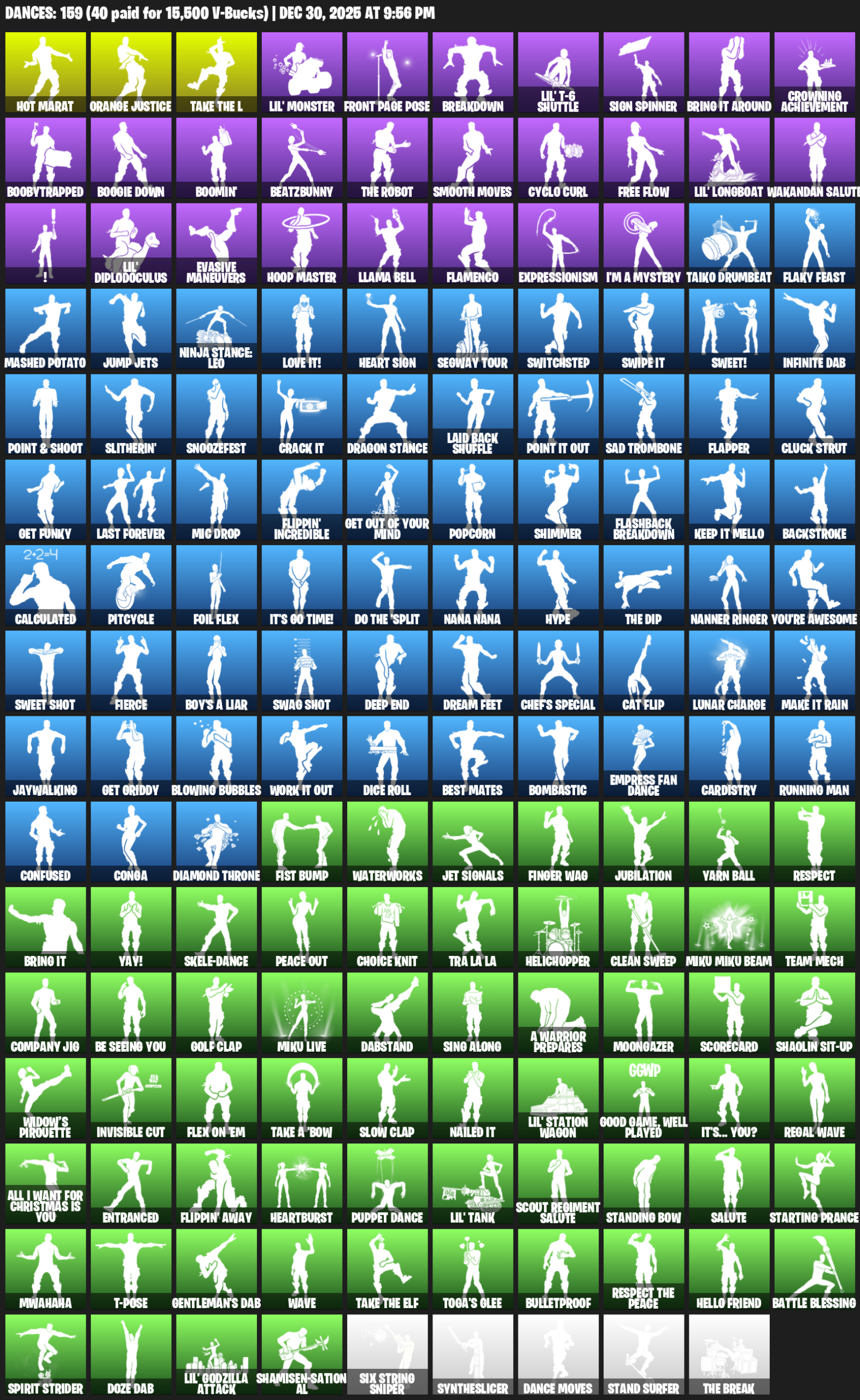 Hot Marat, Orange Justice, Lil’ Monster, Front Page Pose, Breakdown, Sign Spinner, Bring it around, Crowning Achievement, Boobytrapped, Boogie Down, Boomin’, BeatzBunny, Smooth Moves, Cyclo Curl, Free Flow, Wakandan Salute