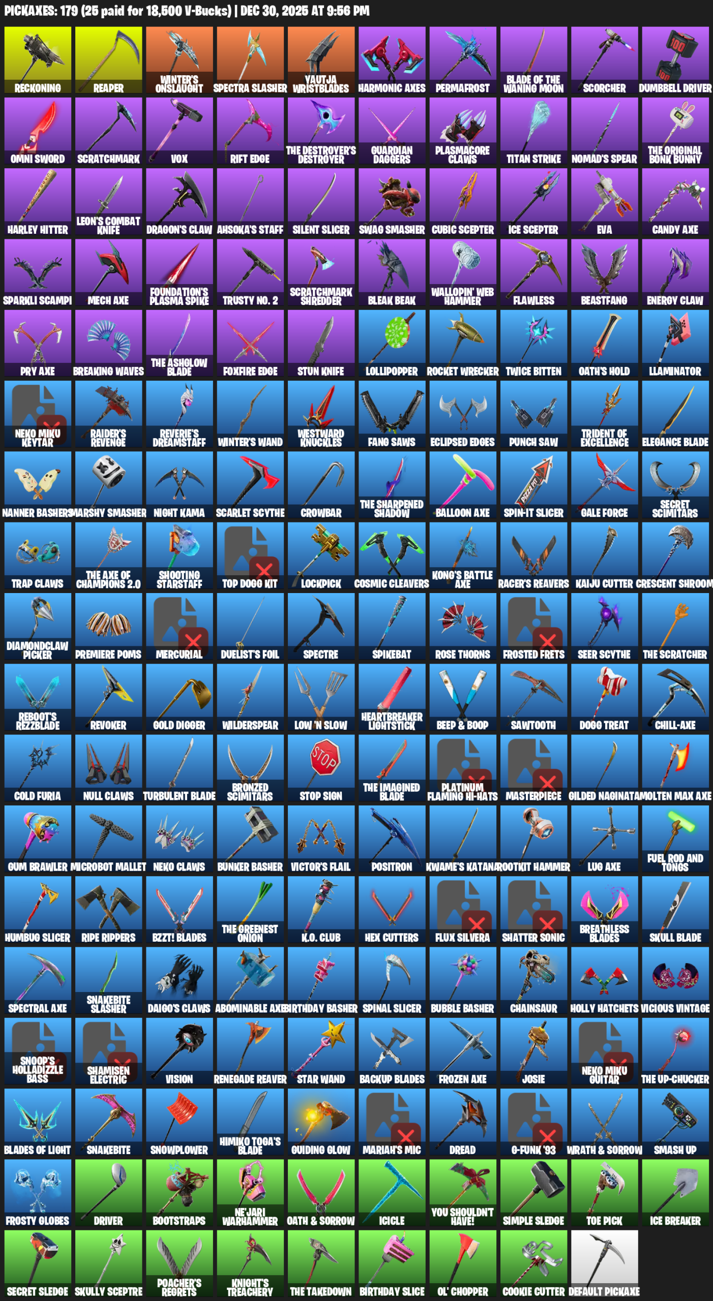Raider’s Revenge, Reckoning, Winter’s Onslaught, Spectra Slasher, Yautja Wristblades, Harmonic Axes, Permafrost, Scorcher, Dumbbell Driver, Omni Sword, Scratchmark, Vox, Rift Edge, Guardian Daggers, Plasmacore Claws, Titan Strike, Nomad’s Spear