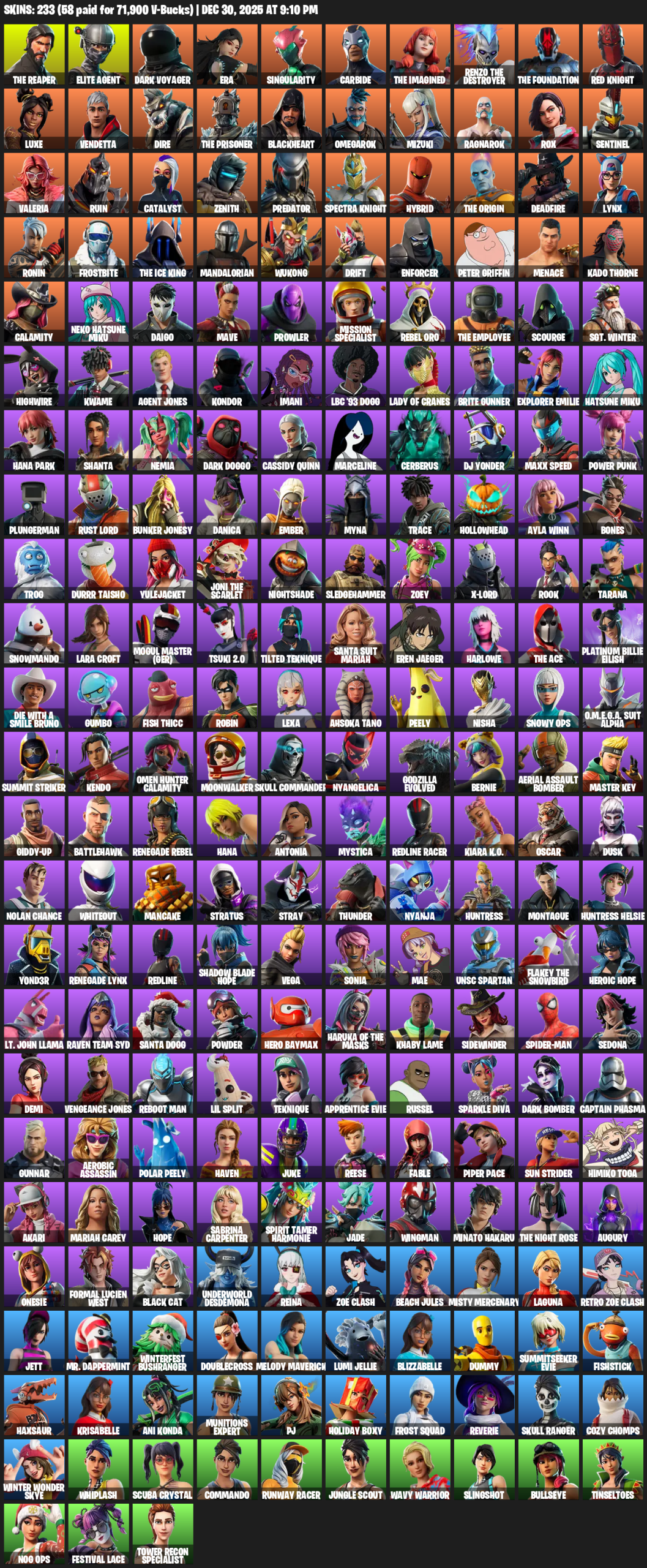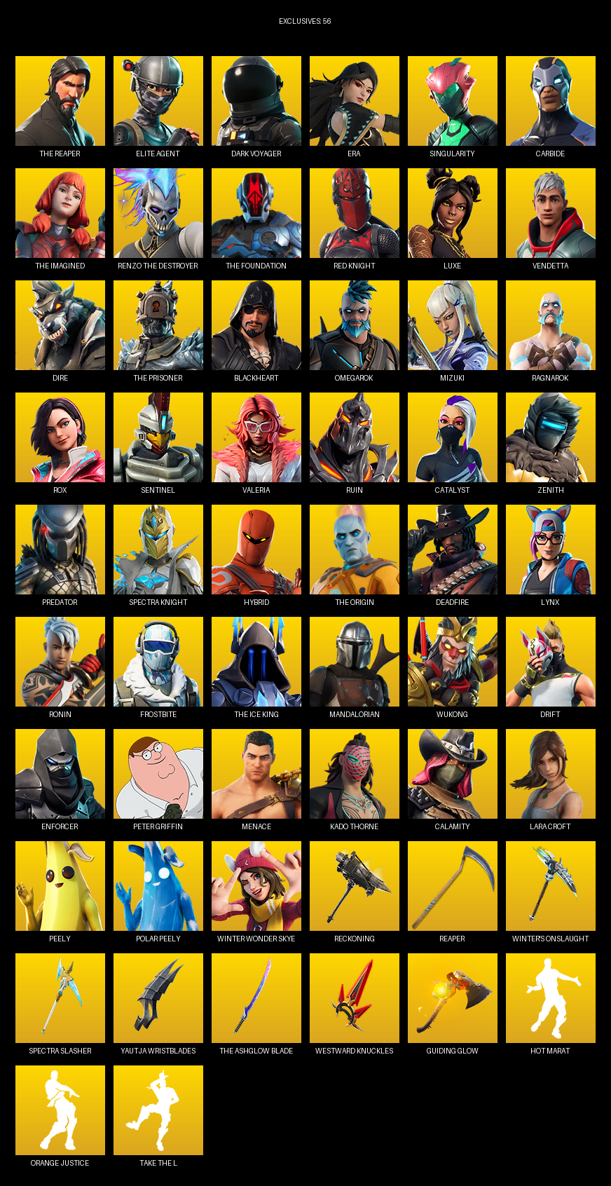The Reaper, Elite Agent, Lara Croft, Dark Voyager, Era, Singularity, Carbide, Red Knight, Luxe, Vendetta, Dire, Blackheart, Omegarok, Mizuki, Ragnarok, Rox