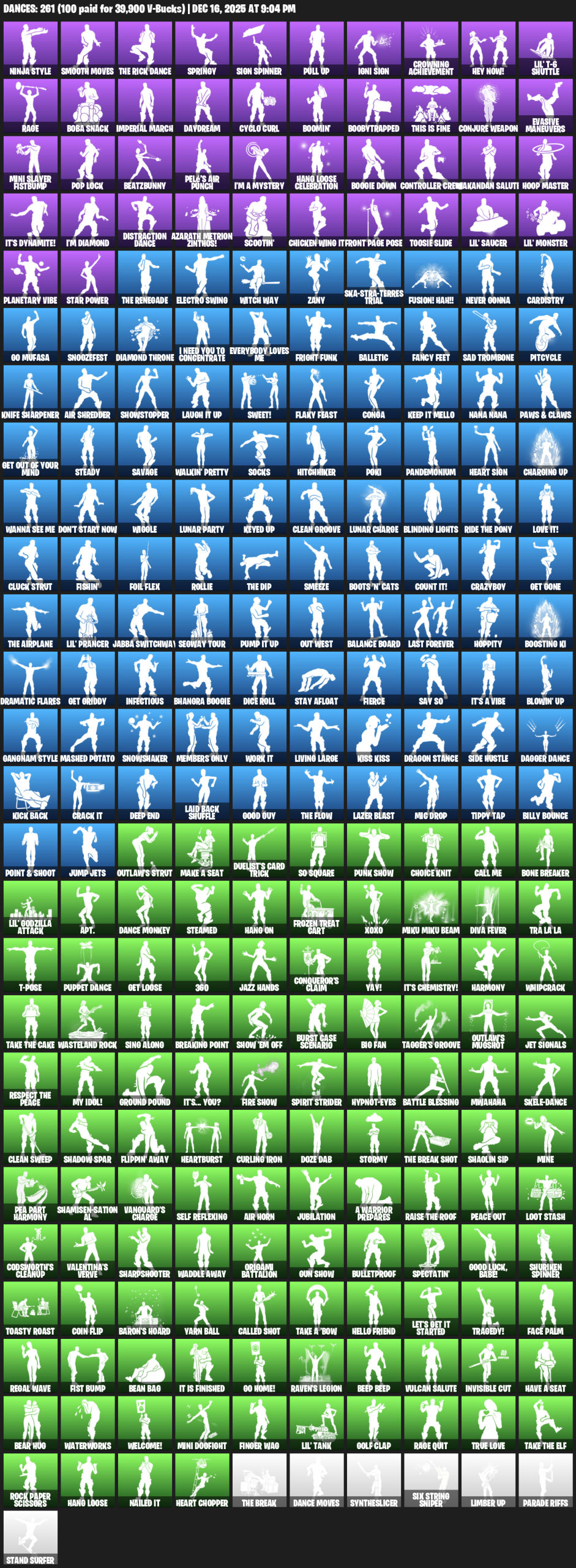 Ninja Style, Smooth Moves, Springy, Sign Spinner, Pull Up, Crowning Achievement, Hey Now!, Lil’ T-6 Shuttle, Rage, Boba Snack, Imperial March, Daydream, Cyclo Curl, Boomin’, Boobytrapped, This is Fine, Conjure Weapon, Evasive Maneuvers