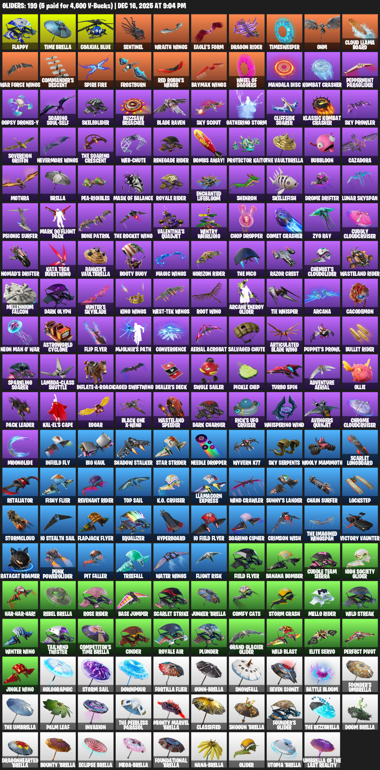 Flappy, Time Brella, Coaxial Blue, Wraith Wings, Eagle’s Form, Timesweeper, Ohm, Cloud Llama Board, Commander’s Descent, Frostburn, Mandala Disc, Kombat Crasher, Peppermint Paraglider