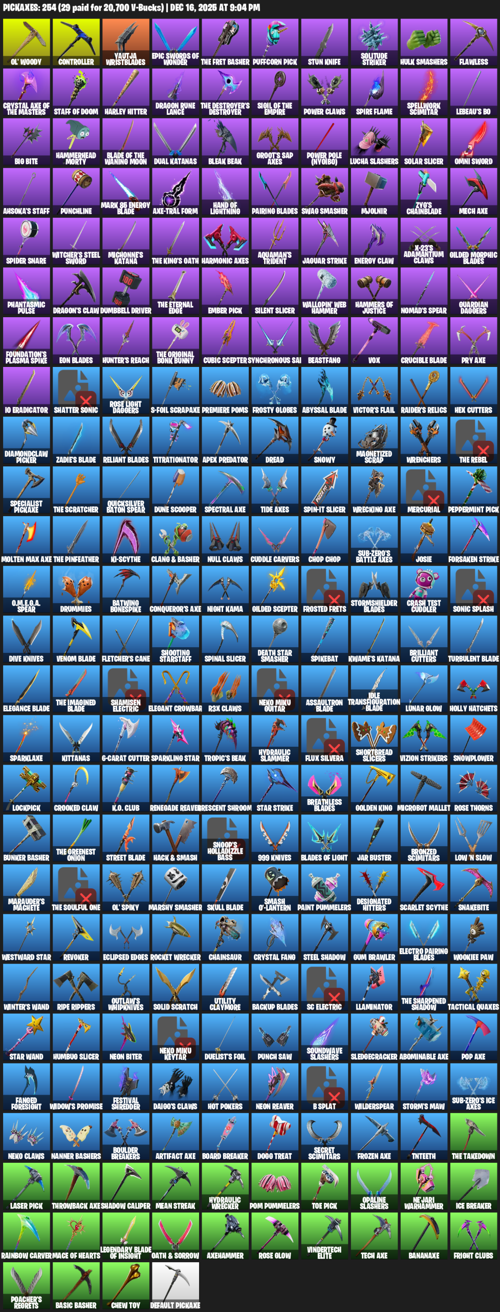Ol’ Woody, Controller, Yautja Wristblades, Puffcorn Pick, Stun Knife, Solitude Striker, Hulk Smashers, Flawless, Staff of Doom, Harley Hitter, Dragon Rune Lance, Power Claws, Spire Flame, Spellwork Scimitar, LeBeau’s Bo