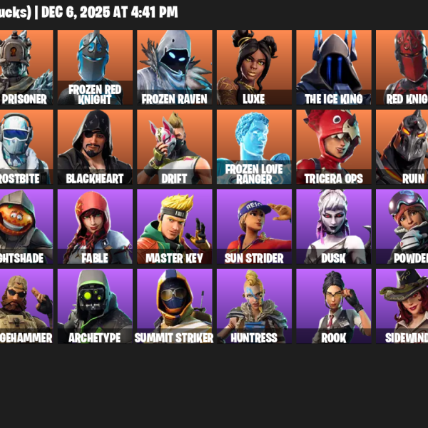 Ruin, Sentinel, Hybrid, Vendetta, Singularity, Rox, Blackheart, Explorer Emilie, Polar Peely, Felina, Slayer Juice WRLD, Bunker Jonesy, Demi, Ember, Sidewinder, Yulejacket, Stratus, Master Key, Vega