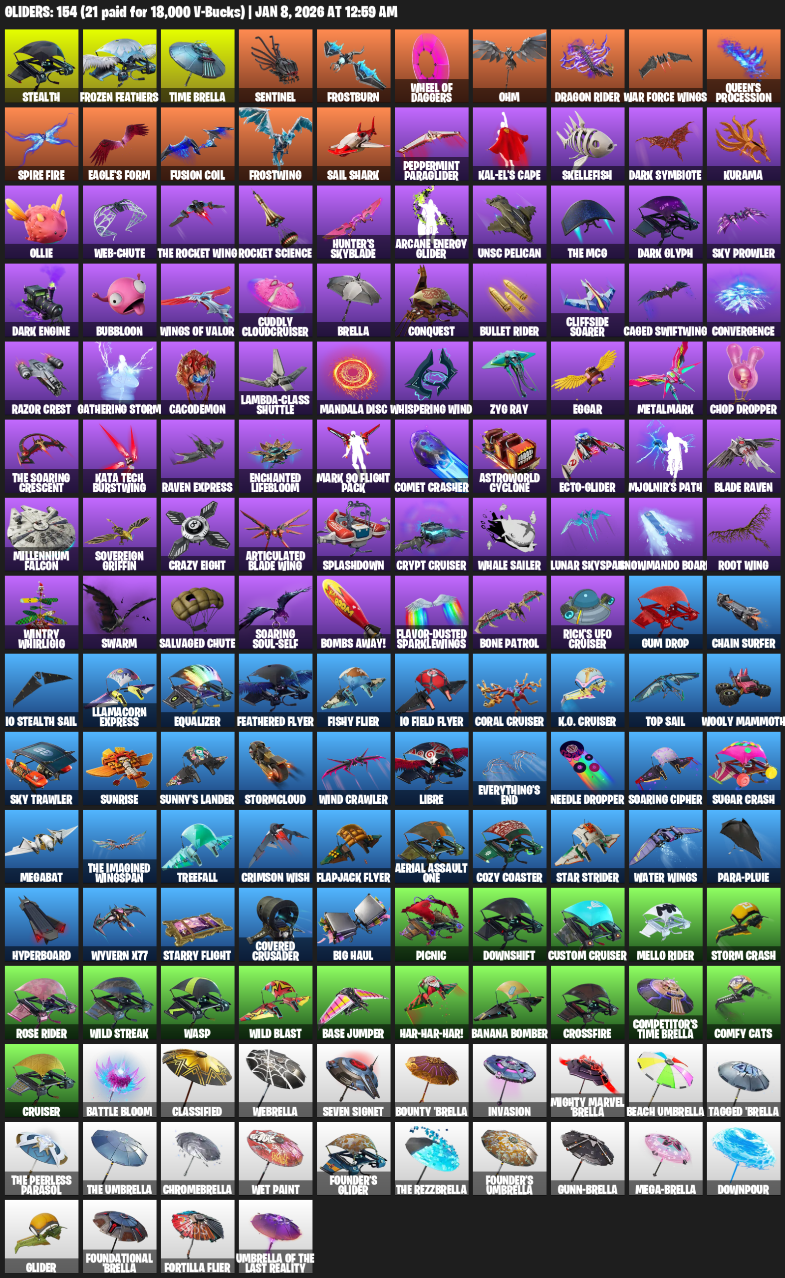 Stealth, Frozen Feathers, Time Brella, Sentinel, Frostburn, Ohm, Dragon Rider, War Force Wings, Queen’s Procession, Spire Fire, Eagle’s Form, Fusion Coil, Frostwing, Sail Shark, Peppermint Paraglider, Kal-El’s Cape, Skellefish, Kurama