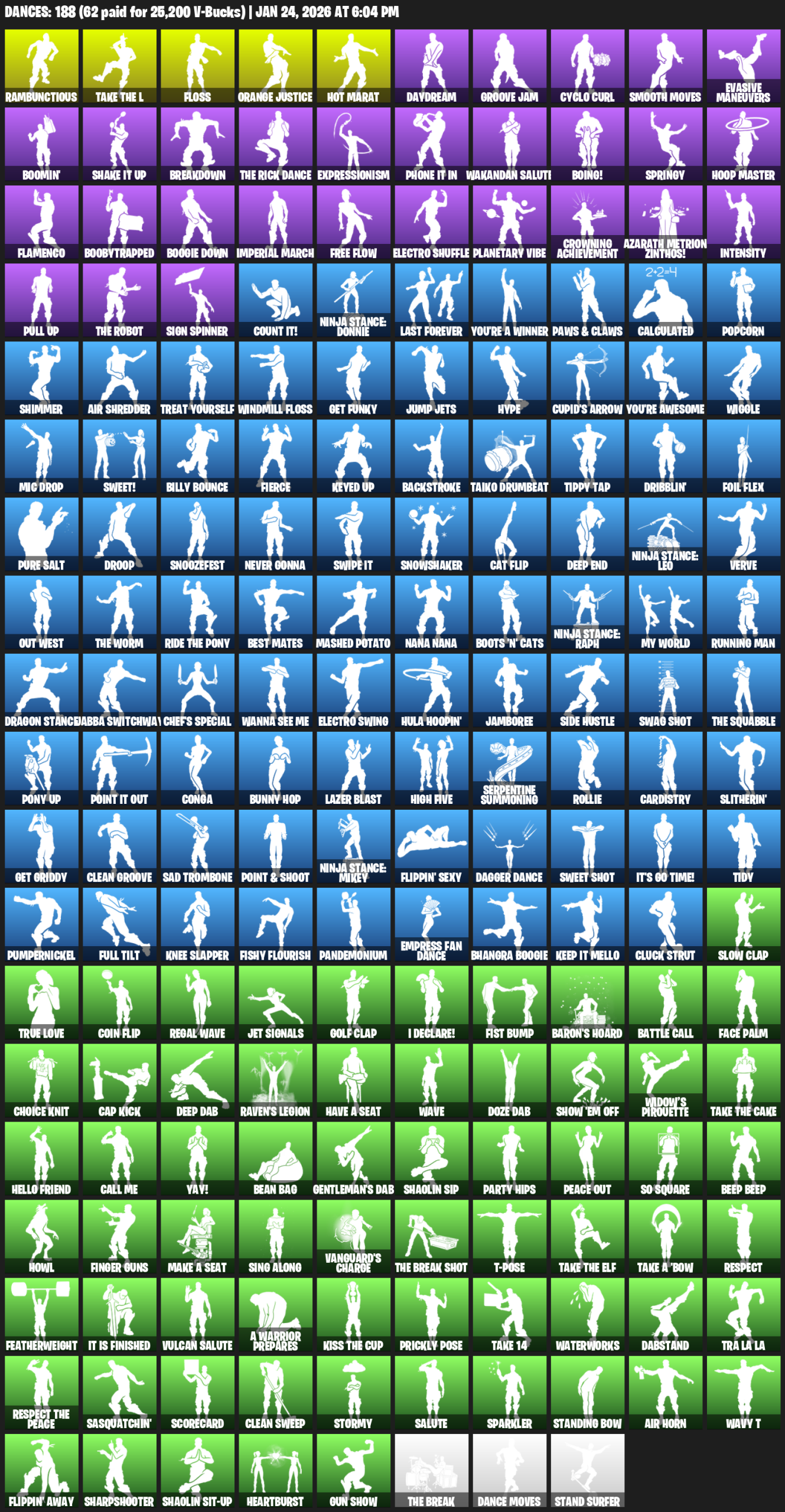 Floss, Hot Marat, Rambunctious, Orange Justice, Daydream, Groove Jam, Cyclo Curl, Smooth Moves, Evasive Maneuvers, Boomin’, Shake It Up, Breakdown, Expressionism, Wakandan Salute, Boing!, Springy, Hoop Master