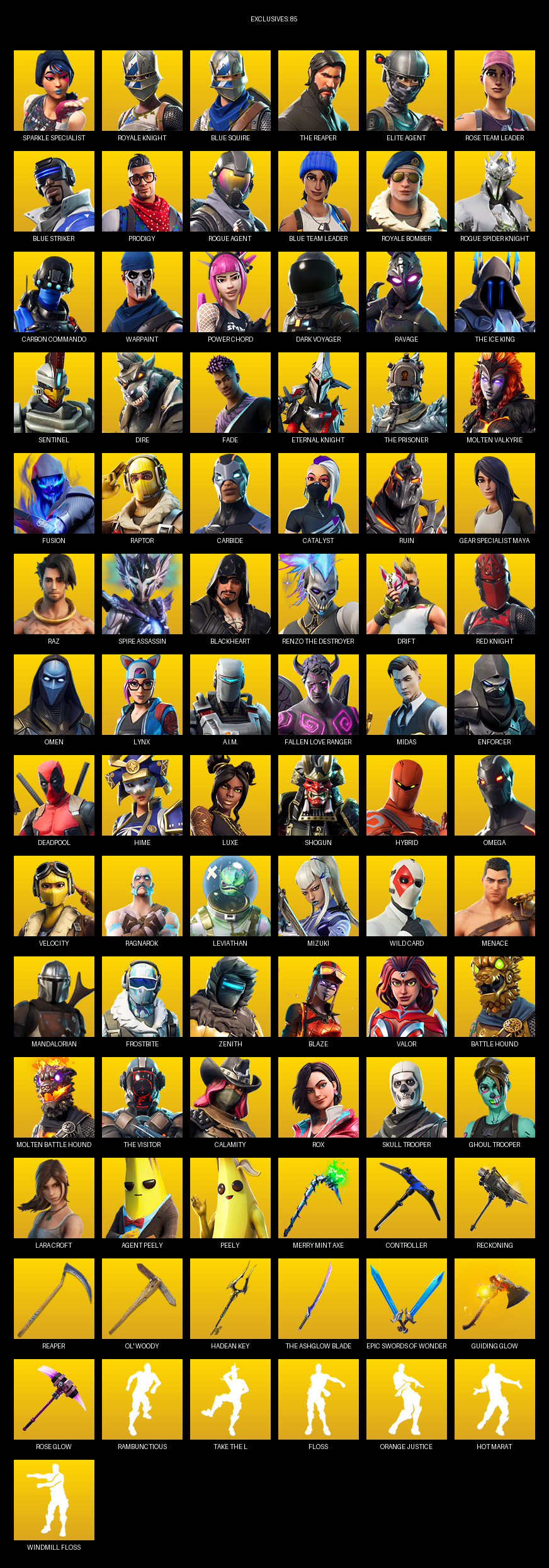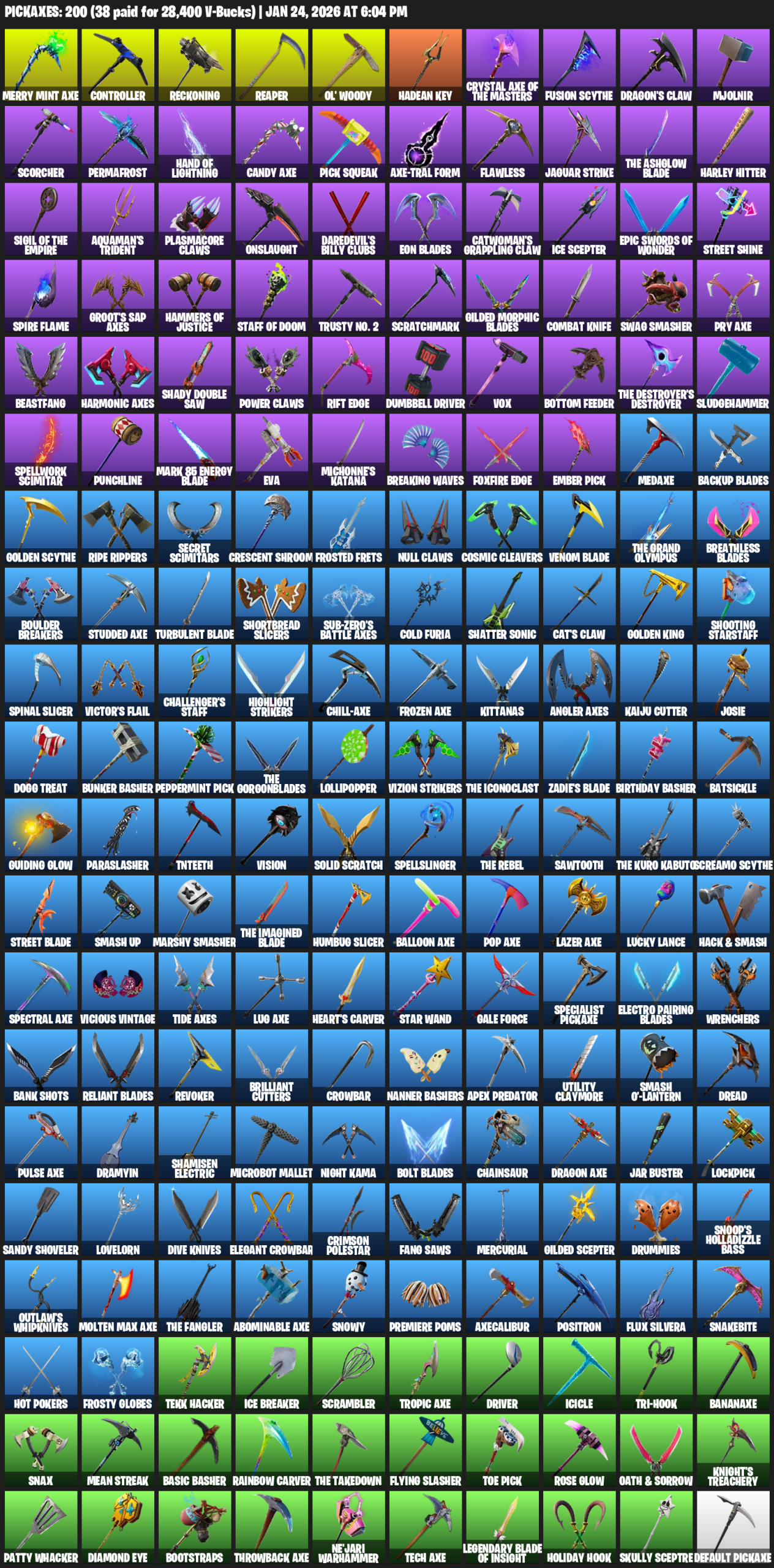 Merry Mint Axe, Controller, Reckoning, Ol’ Woody, Hadean Key, Fusion Scythe, Dragon’s Claw, Mjolnir, Scorcher, Permafrost, Hand of Lightning, Pick Squeak, Flawless, Jaguar Strike, Harley Hitter